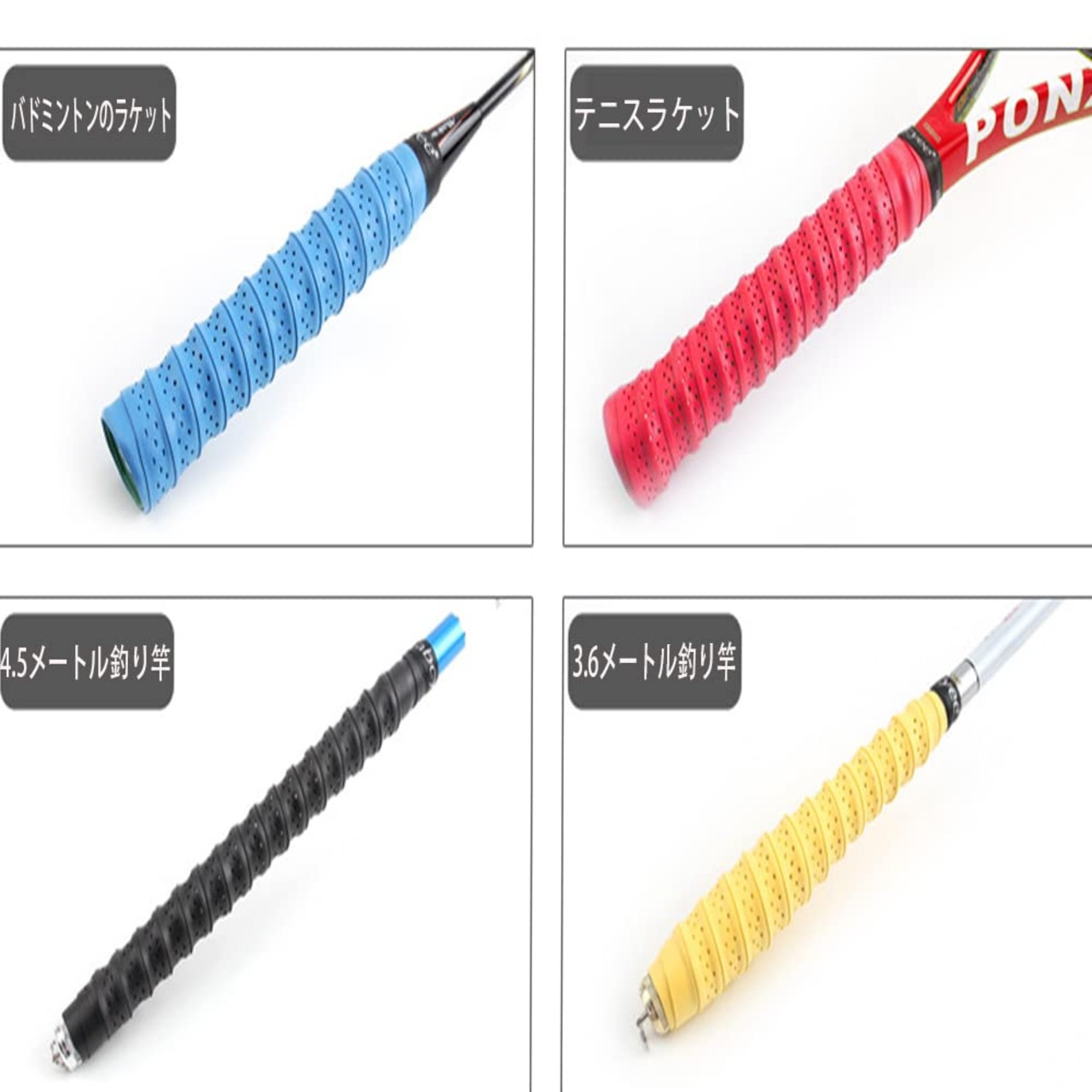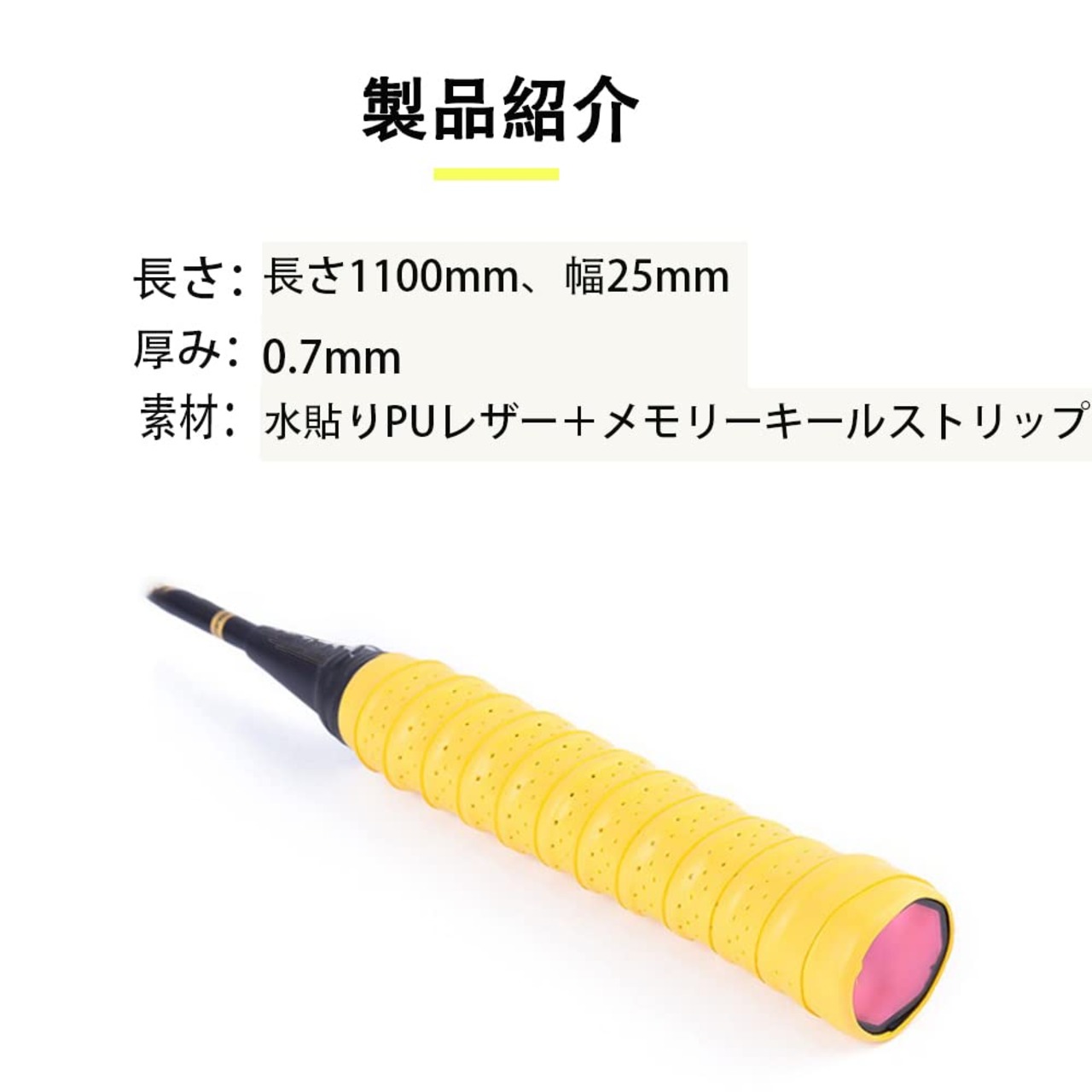 【製品仕様】5本 サイズ:長さ約113cm、幅約2.5cm、厚さ約0.7mm 重さ:約8g 素材:PUレザー 薄くて丈夫で、柔らかく、クッション性があります。ご注意:表面の薄膜は使用時に引き裂かなければなりません。カラー:(レッド、イエロー、ホワイト、ブルー、ブラック)ご注意!!表面の薄膜は使用時に引き裂かなければなりません!!!<br>【通気口の設計】通気性と耐摩耗性の向上、効果的な滑り止め、より良いタッチ。デザイン:隆起したエッジがグリップを向上させ、衝撃を軽減します。 ハンドルを握りやすく、快適に過ごせます。<br>【材質】リップベルトは素材PUで、耐摩耗性、ソフトで快適、握力が弱い人でもしっかりと握れます。<br>【簡単に交換する】ベルトを持っていれば簡単に交換できます。面倒なハンドル交換の仕事はありません。ゴルフのグリップが細いと、悩んでいる人も安心してください。グリップを太くしたい時は、重ねて巻くだけで簡単です。<br>【広く使う】テニス、バドミントン、釣り竿、ゴルフクラブ、太鼓のハチなど、幅広く使うことができます。軽くて持ちやすいですラケットの試合以外に、トレーニングに使うバーベル、ダンベル、自転車とバイクの取っ手、釣り竿の取っ手、道具なども取っ手の滑り止めとして使えるので、とても便利です。使いやすいグリップは、ぜひスポーツ、レジャー、仕事などに使ってください。