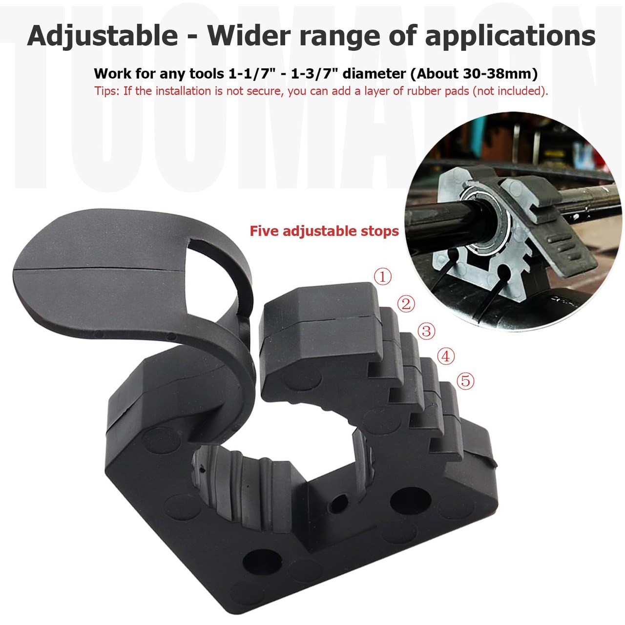 ▶調節可能な寸法:ゴムクランプは直径1-1/7インチから1-4/9インチ(30-38mm)まで調節可能で、シャベル、斧、消火器、その他の農機具に適合します。 より多くのスペースを解放するのに役立ちます。