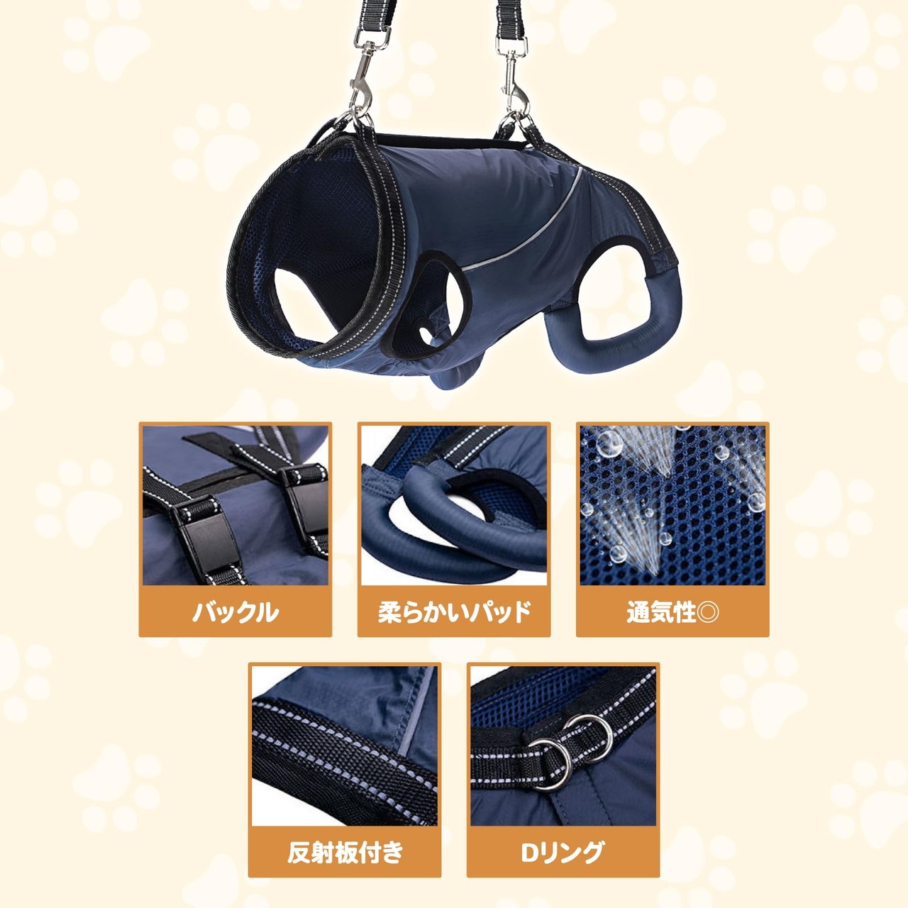 【サイズ・仕様】【サイズ】XS、S、M【カラー】イエロー、オレンジ、ネイビーブルー【材質】軽量通気素材、反射素材【特徴】歩行補助、リハビリ・介護対応、夜間反射、簡単脱着【適用】小型犬・中型犬・大型犬、老犬や快復中の犬のサポートに最適