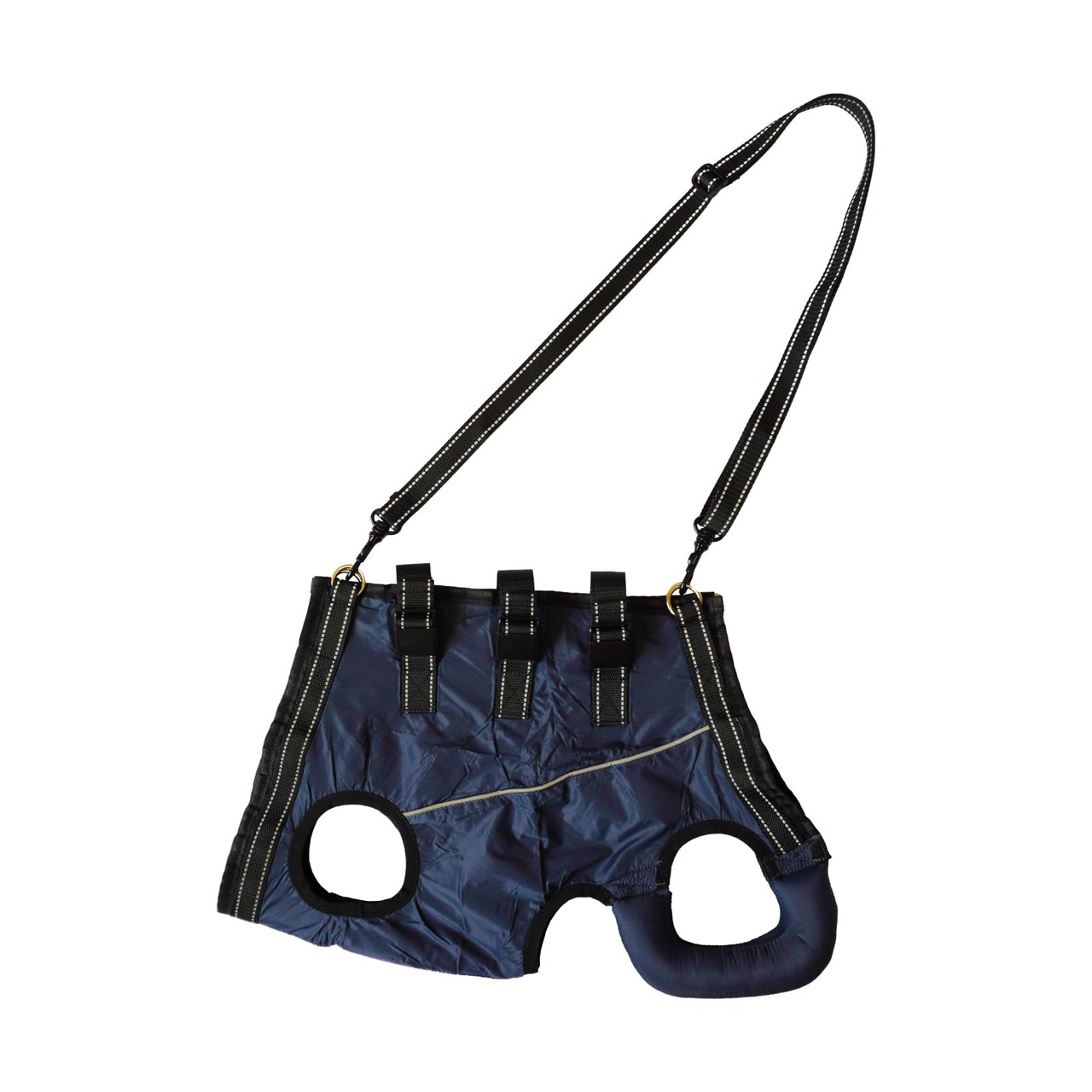 【歩行をサポートする犬用介護ハーネス】老犬やリハビリ中の愛犬の歩行をしっかり補助する設計で、階段の昇り降りや車の乗り降りもサポート。夜間散歩も安心の反射材付きで、毎日の移動を安全に支えます。