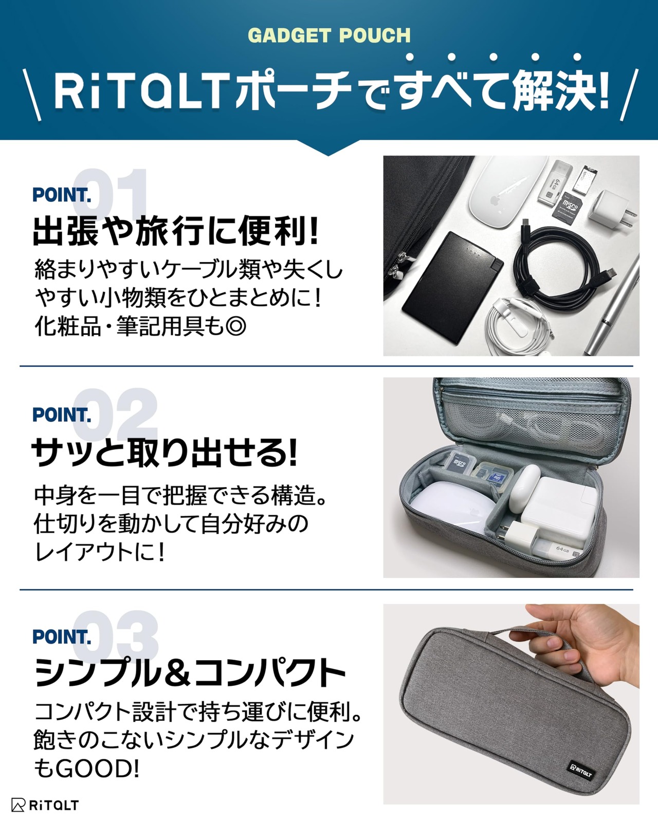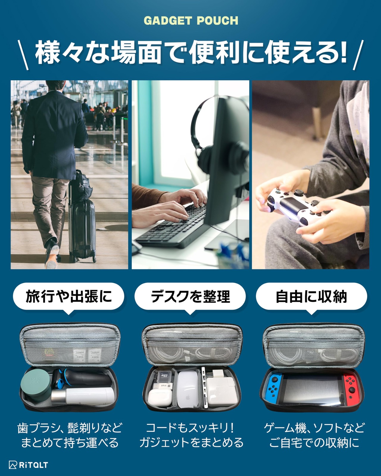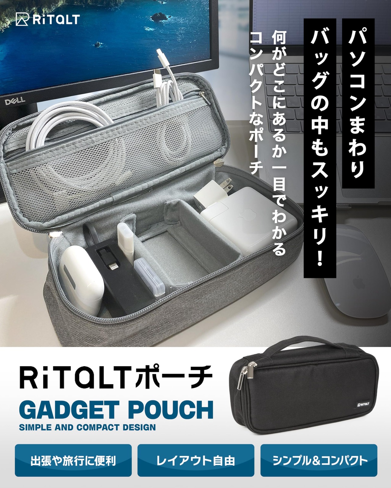 RITALT ガジェットポーチ ガジェットケース 小型 ポーチ 小さめ 小物入れ トラベルポーチ 旅行用 出張 仕事 (ブラック)