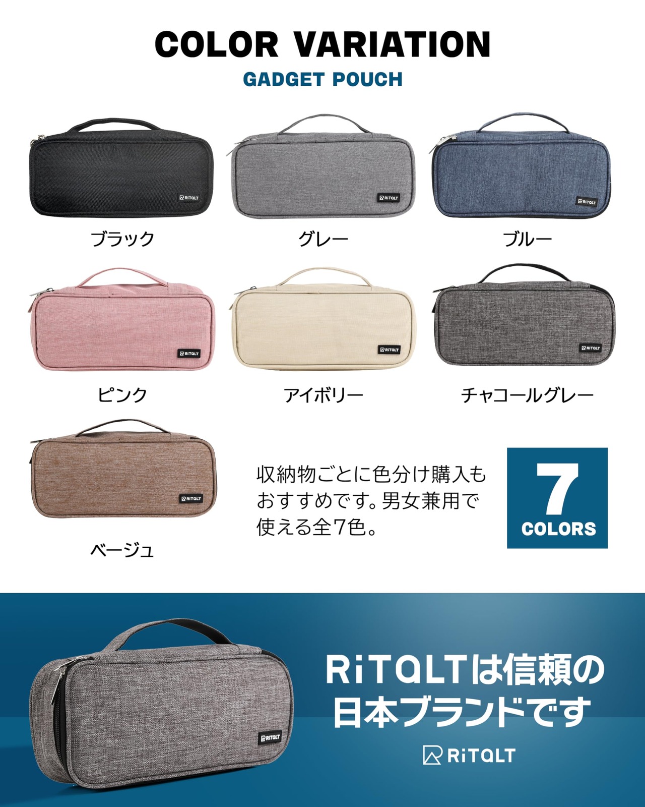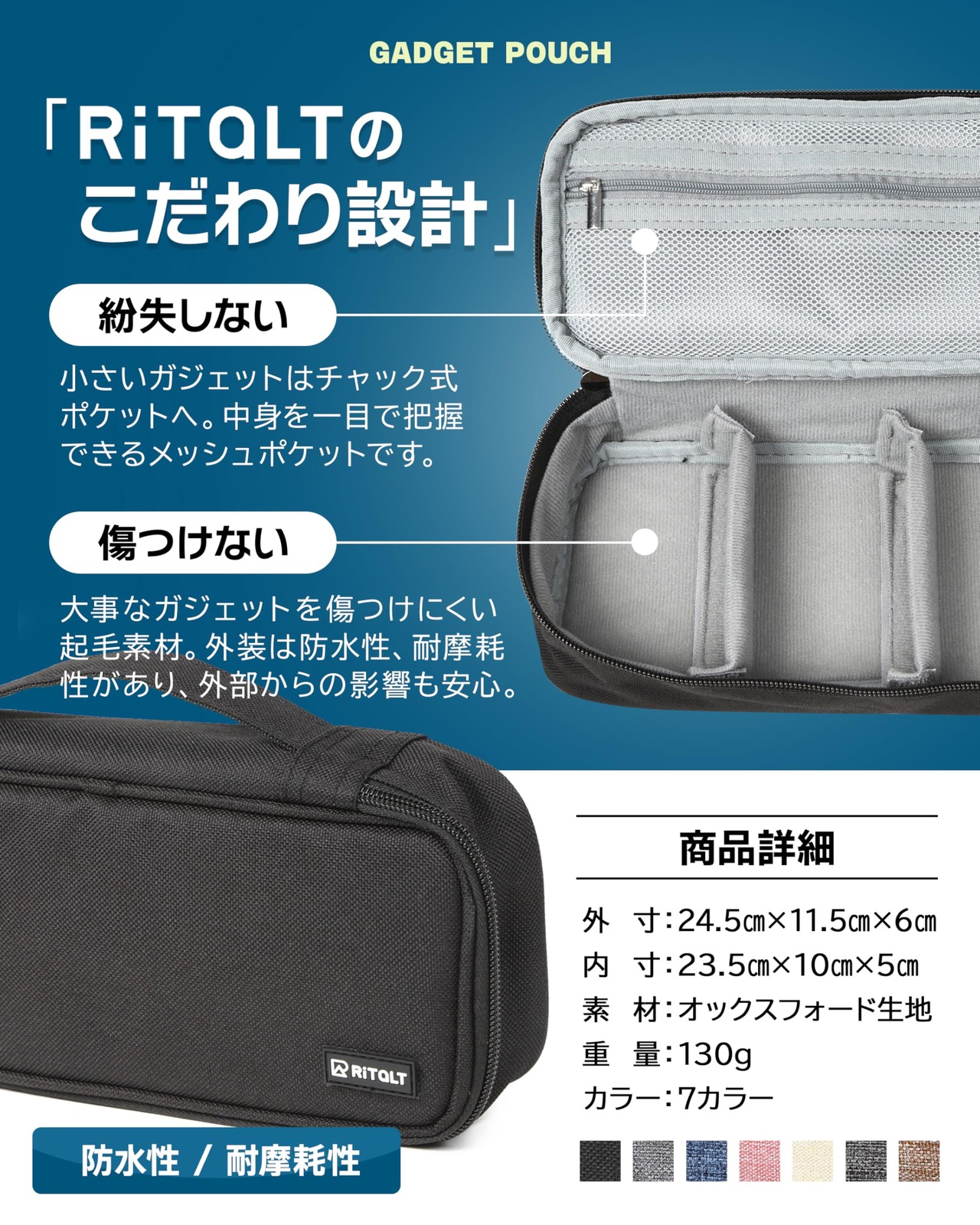 【商品詳細】〇サイズ:外寸24.5cm×11.5cm×6cm、内寸23.5cm×10cm×5cm 〇素材:オックスフォード生地 〇重量:130g 〇カラー:7カラー 〇セット内容:本体、結束バンド4本 〇ブランド:RiTaLT