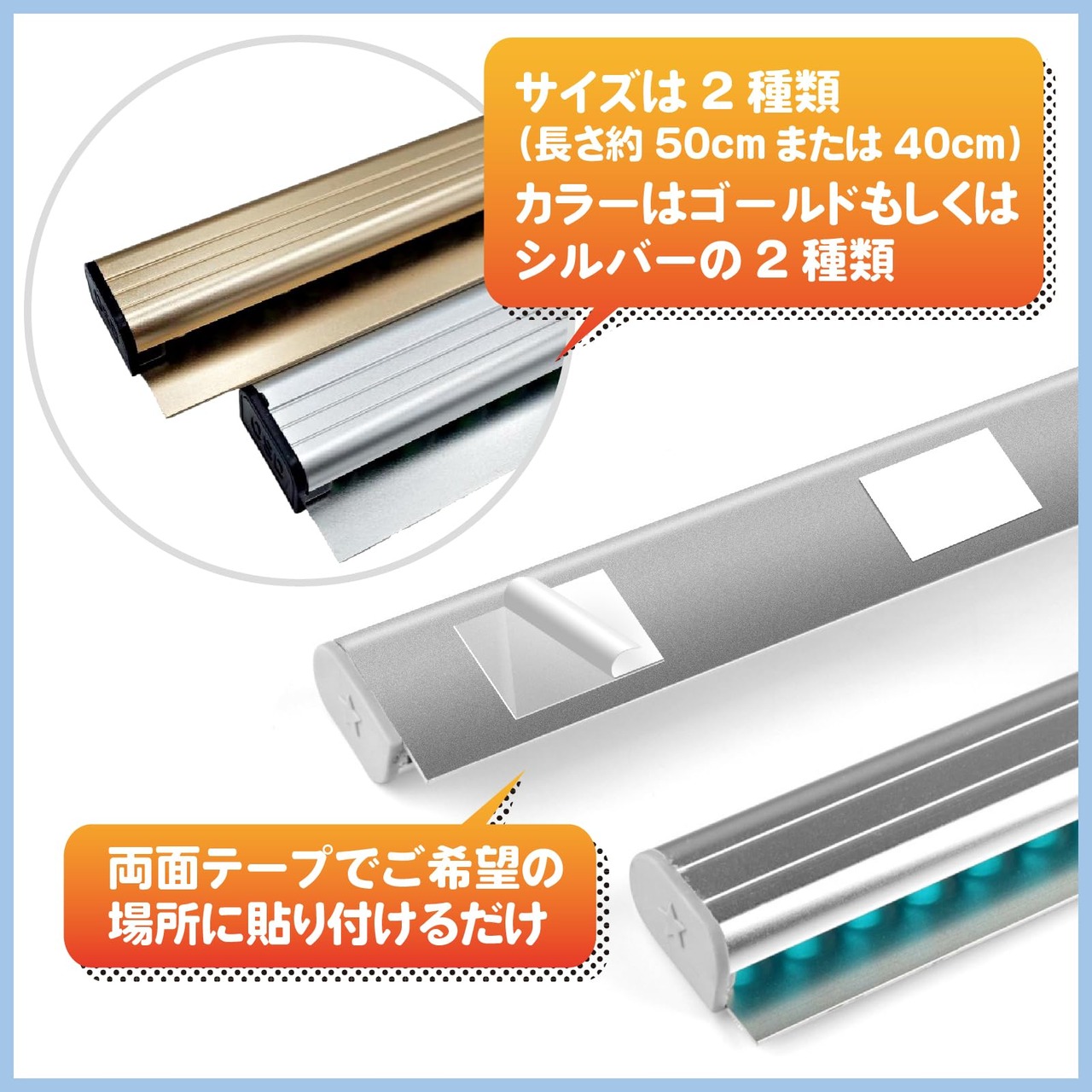 サイズは2種類(長さ約50cmまたは40cm)、カラーはゴールドもしくはシルバーの2種類がございます。お店、デスク、インテリアにあわせてお選びください。