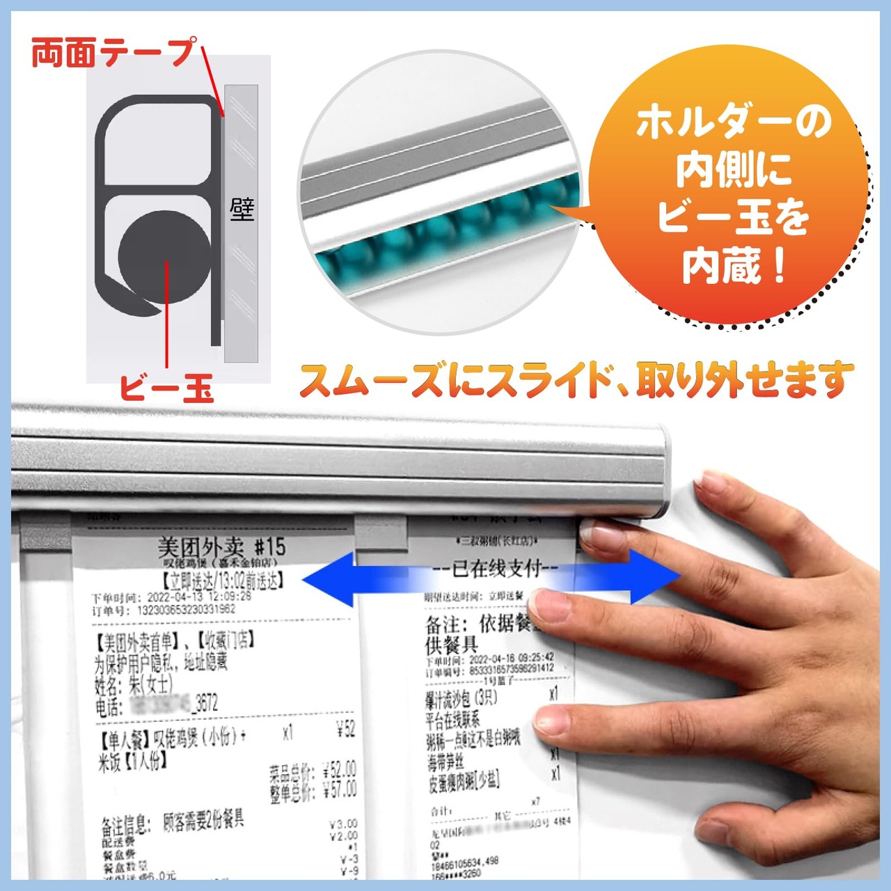 ホルダーの内側にビー玉を内蔵、挟めた伝票を破ることなく、スムーズにスライド、取り外せます。オーダーが重なった時、順番を間違えずに提供するためにも、飲食店に欠かせない商品です。