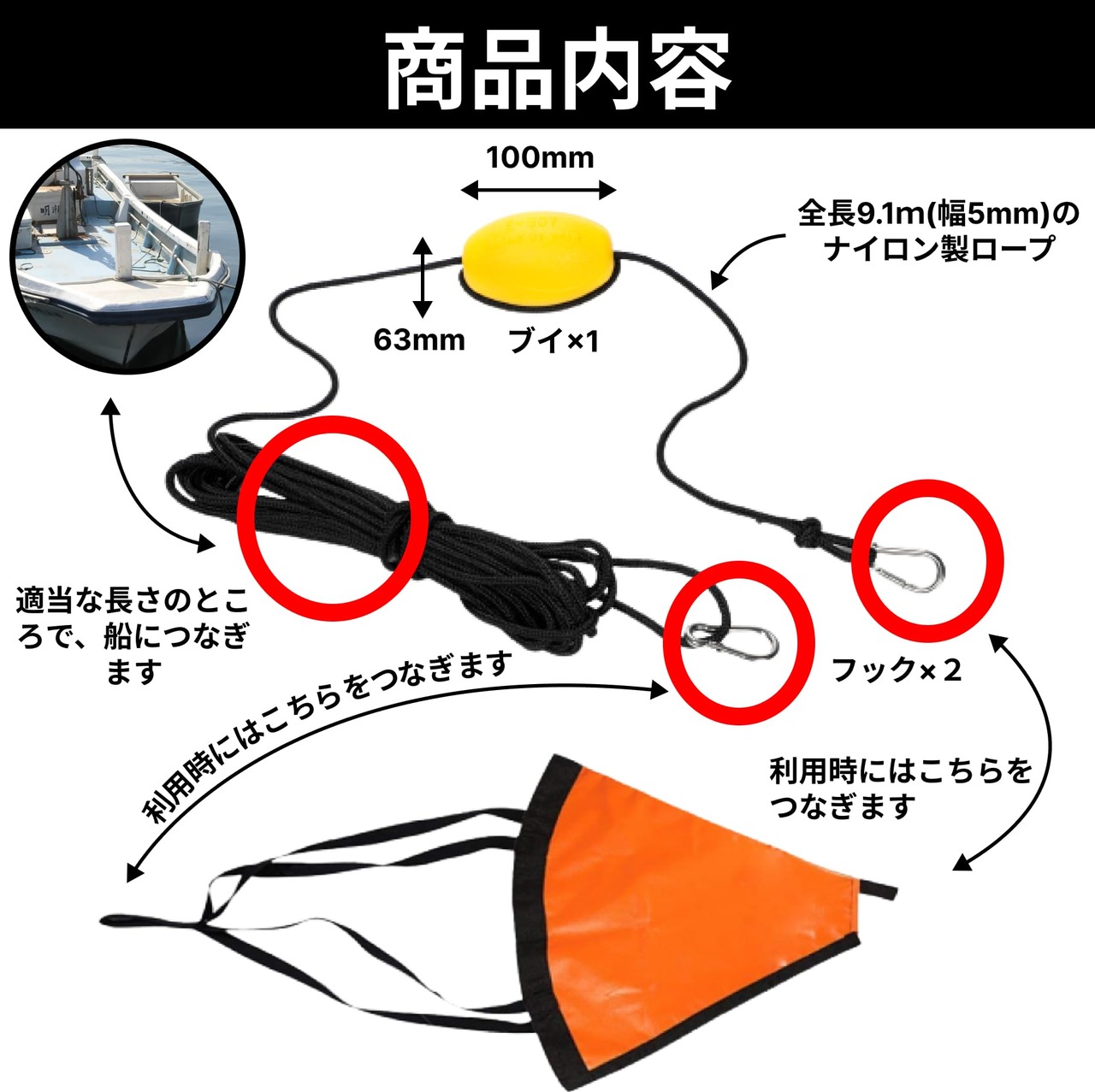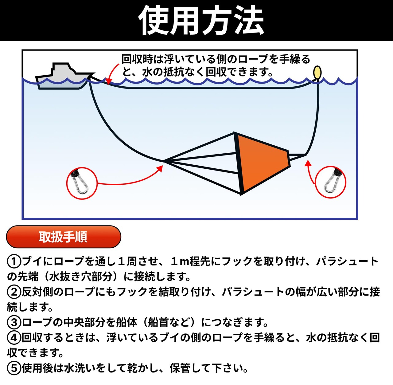 【使用方法】 ①ブイにロープを通し1周させ、1m程先にフックを取り付け、パラシュートの先端(水抜き穴部分)に接続します。 ➁反対側のロープにもフックを結取り付け、パラシュートの幅が広い部分に接続します。 ③ロープの中央部分を船体(船首など)につなぎます。 ④回収するときは、浮いているブイの側のロープを手繰ると、水の抵抗なく回収できます。
