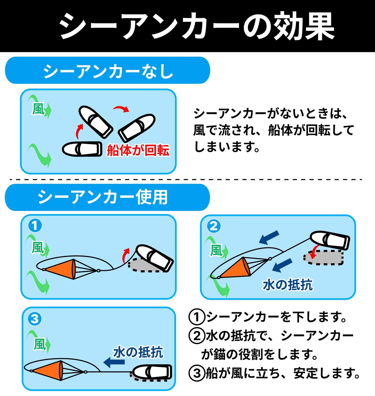 【特徴:①アンカーの機能・②シーアンカーの回収に役立つフロート・③コンパクトな収納】 ①パラシュートアンカーは、横風でボートが流されそうになったとき、海流を捉えることでボートを安定化させます。海流によって船体が大きく流されてしまうと不安になるかもしれませんが、パラシュートアンカーが捉える海流は、表面の海流よりも比較的穏やかなため、表面の海流ほどには流れません。 ②フロートをつけることで、使用中にパラシュートアンカーが海底に沈むことを防ぎ、海中でパラシュートアンカーが海流を捉えやすくします。また、回収時にはパラシュートアンカー側のロープを引き上げるのではなく、フロート側のロープを手繰っていくことで、パラシュートアンカー全体を回収することが容易になります。 ③利用後、パラシュートアンカーは水洗いをして、干して十分に乾かして下さい。パラシュートアンカーには折り目がありますので、コンパクトにたたむことが出来ます。ブイのサイズも大きくないので、パラシュートアンカーおよびロープもまとめて収納できます。