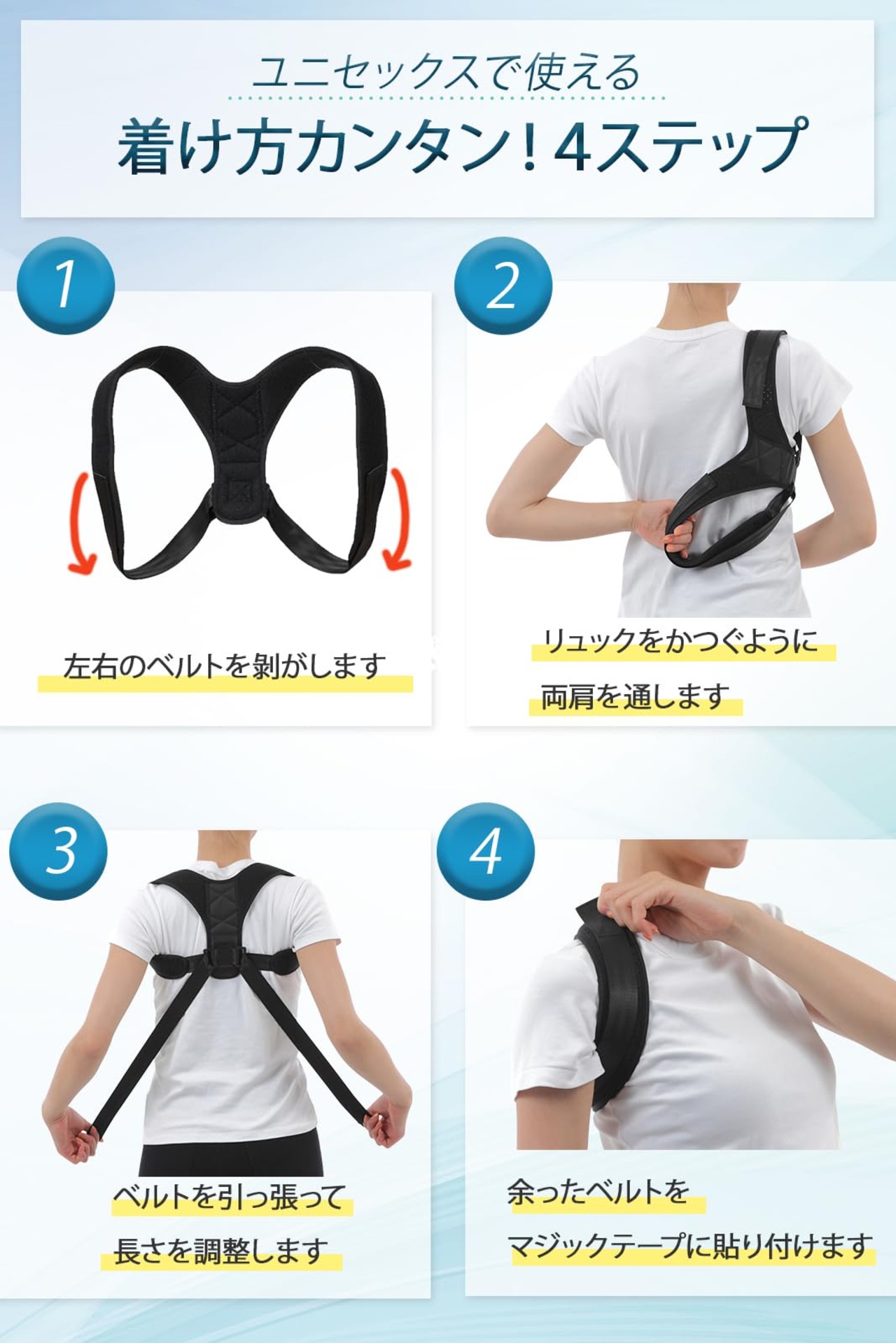 【■猫背改善!着けるだけで姿勢を矯正】手軽に装着できる姿勢矯正サポートベルト。服の上、下、どちらでも装着可能です。特に意識しなくても、丸まった猫背を徐々に改善。日常生活の邪魔にならず、自然と背筋がすっきり伸びてきます。