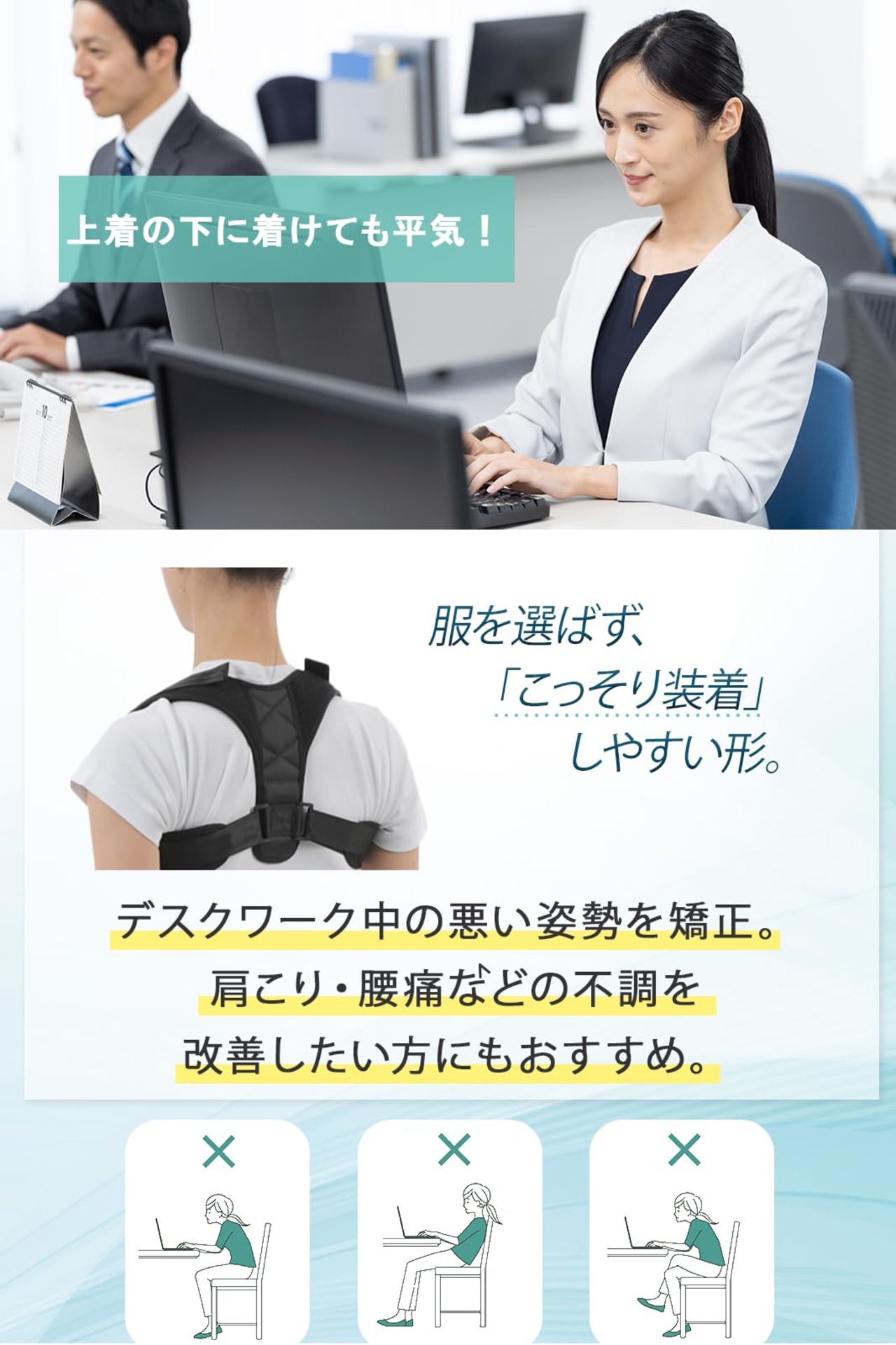 「デスクワークサポートで姿勢を完璧に!」<BR> 長時間のデスクワークで姿勢が悪くなり悩んでいませんか?健康的な姿勢を維持するためのソリューション「デスクワーク専用姿勢サポート」をご紹介します。<BR> <BR> ユニバーサルデザイン、パーソナライズされた快適さ:<BR> 調整可能で、男性と女性の両方に適しています。ベルトの位置をカスタマイズして最適な快適さを実現します。独自の背面デザインにより通気性に優れ、長時間の使用でも不快感を防ぎます。<BR> <BR> 動作の安定性:<BR> 安定したサポートを体験し、肩への負担を軽減し、不快感を解消します。前面のストリング調整により、カスタマイズされたサポートが可能です。最初は短時間の使用から始めて、最適な結果を得るために徐々に使用量を増やしてください。<BR> <BR> 通気性に優れた高品質素材:<BR> 当社のオリジナル生地は通気性が高く、一年中着用に最適です。洗濯機で簡単にお手入れできるので、オフィスでもご家庭でも、毎日のルーチンに簡単にフィットします。<BR> <BR> 幅広い用途:<BR> 激しいゲームから集中した読書セッションまで、さまざまなアクティビティに最適です。スマートフォンの頻繁な使用から長時間のドライブまで、あらゆるシナリオに適応し、健康的なライフスタイルのための理想的な姿勢習慣を促進します。<BR> <BR> 自信と健康を高める:<BR> 正しい姿勢は身体的な負担を軽減するだけでなく、精神的な幸福も高めます。集中力、効率性の向上、自信に満ちた前向きな態度など、すぐに効果を感じてください。<BR> <BR> 着やすい、目立たないデザイン:<BR> ボタンシャツやジャケットの下に自由に着用できます。サポートは、注目を集めることなく、あなたの姿勢を微妙に高めます。長時間のデスクワーク中の疲労や息切れを克服します。<BR> <BR> 顧客満足保証:<BR> 品質を優先し、Amazonのガイドラインに従って返品または交換を提供します。顧客の質問に迅速に対応することで、手間のかからないエクスペリエンスが保証されます。<BR> <BR> この商品で更に素晴らしい貴方が待っています!<BR> <BR> デスクエクスペリエンス(一般的にはデスクワークやオフィスワーク等)の変革<BR> <BR> 背中の不快感に別れを告げ、新たな一歩を踏み出しましょう。<BR> 長時間のデスクワークにおける背中の不快感や姿勢の悩みに終止符を打つべく、我々の「デスクワーク専用姿勢サポーター」が登場しました。<BR> この製品は、通気性に優れた素材と調整可能なデザインが特長です。<BR> 背中を優しくサポートしつつ、適切な姿勢を保つことで、肩こりや猫背の改善に寄与します。また、デスクワークに集中できる快適な使用感が、あなたの仕事や学習体験を変えるでしょう。<BR> <BR> このサポーターは男女兼用でフリーサイズ、しかも装着が簡単。さらに、オリジナルの高透湿・高品質生地を使用し、四季を通じて快適にご利用いただけます。デスクワークだけでなく、様々なシーンに対応するこのアイテムが、あなたの生活を変えるお手伝いをします。<BR> <BR> デスクエクスペリエンスを変革し、背中の不快感にサヨナラを告げましょう。心地よい姿勢で、新たな創造性と健康を手に入れるお手伝いをいたします。