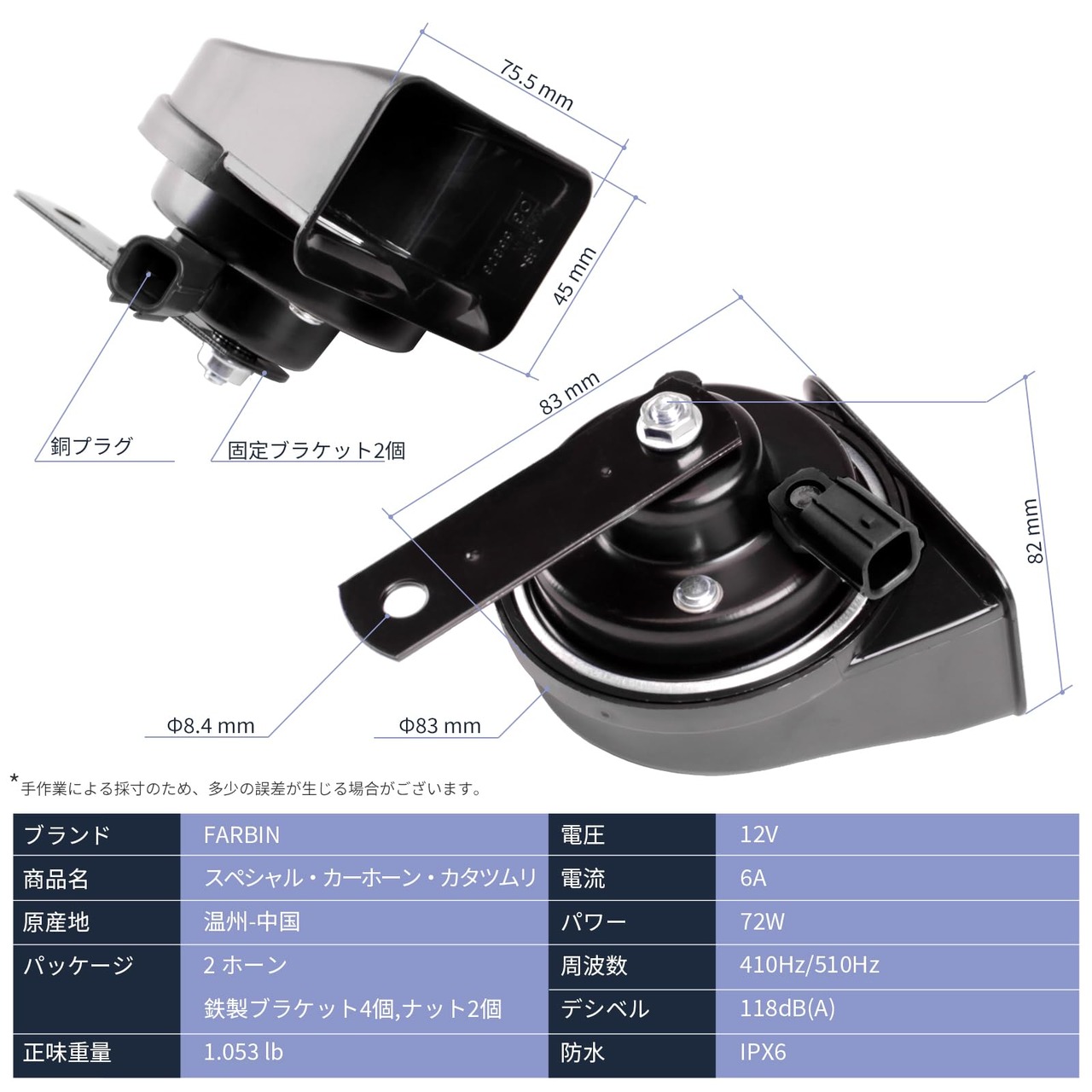 FARBIN 車ホーン 12V 防水 汎用 118db 高音/低音2個セット+二股分岐ハーネス, トヨタ/ホンダ/ニッサン/スズキ適用 車クラクション フラット端子付き配線