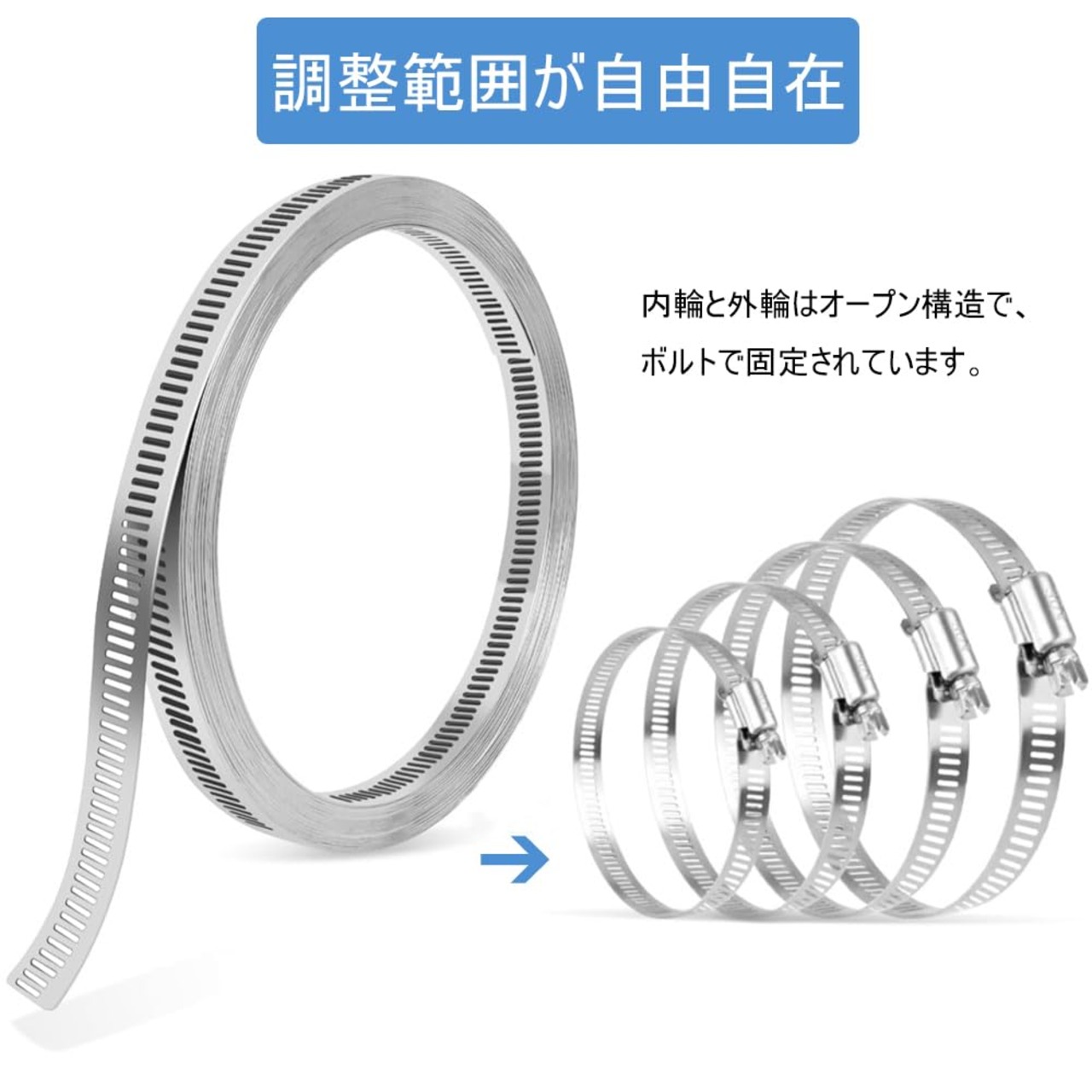 【適用範囲】ホース、パイプ、ケーブル、チューブ、自動車、工業用、ボートなどの固定に適用できます。