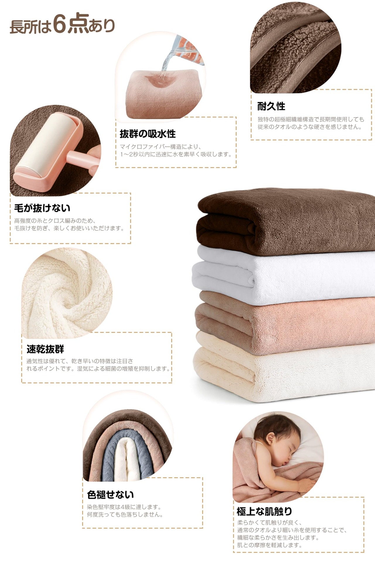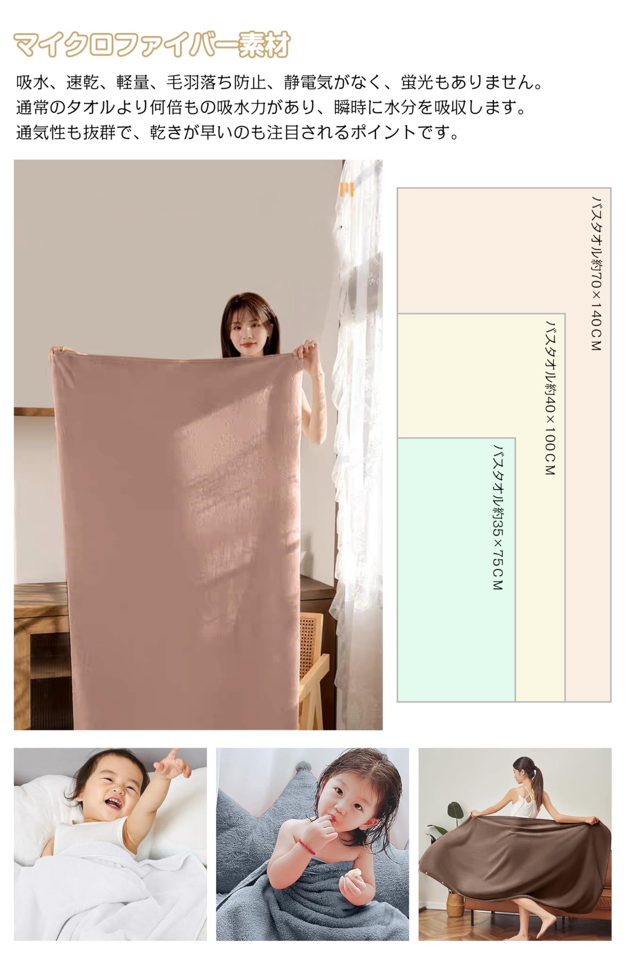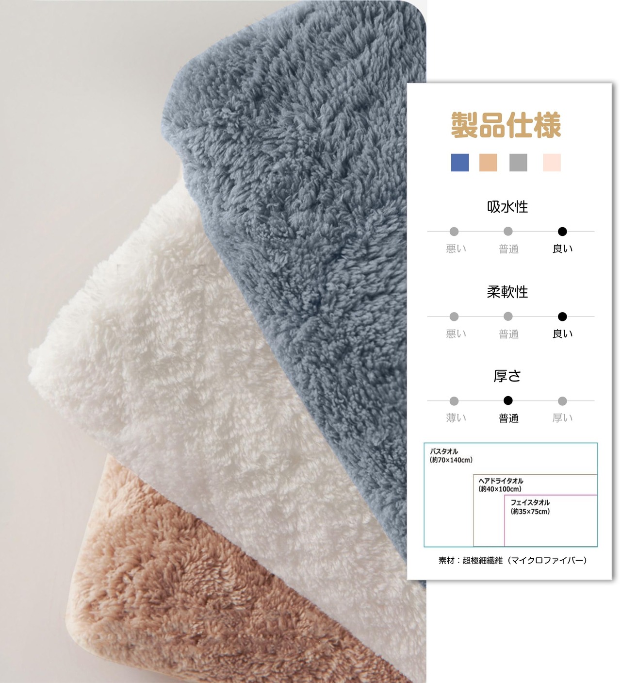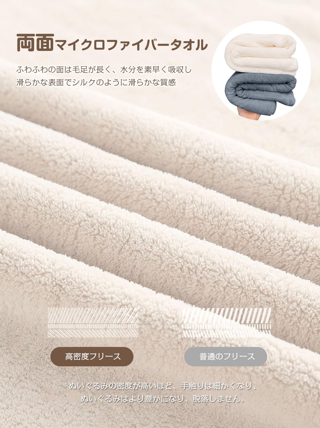 【超極 細マイクロファイバー】柔らかくて肌触りが良く、通常のタオルより細い糸を使用し、繊細で柔らかな感触を生み出し、呼吸をしているかのような機能性を備えた快適な素材です。 特徴:吸水性、速乾性、軽量、線抜け防止、通気性が強い、静電気なし、蛍光なし。 ふわふわの起毛タイプなので、肌も包み込むような優しさです。