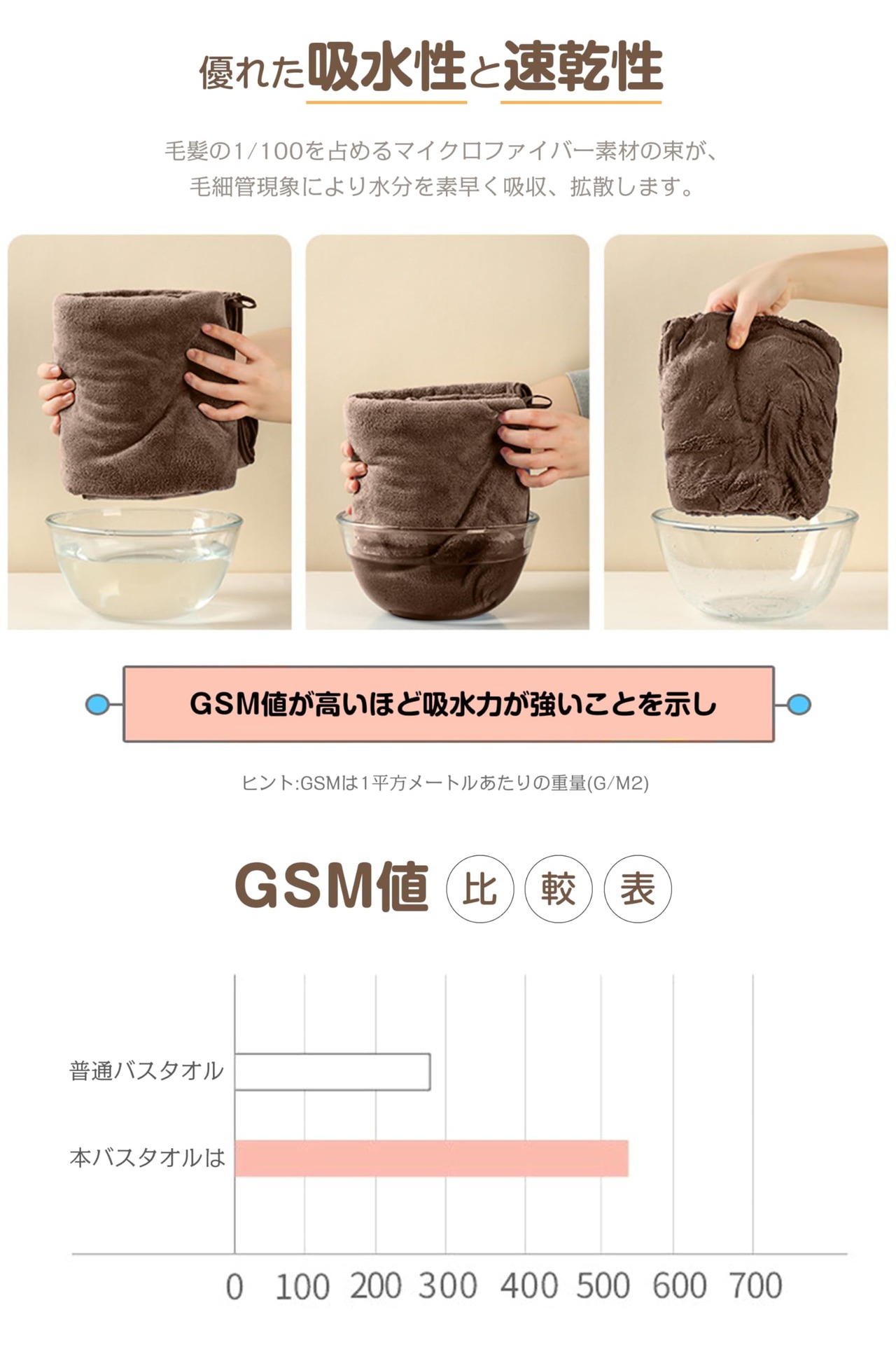 【優れた吸水性と速乾性】綿素材より吸水性に優れています。 マイクロファイバー素材の表面には無数の隙間があり、大量の水分を素早く吸収します。 優れた通気性と速乾性で注目を集めています。 髪や肌に塗るだけで水分を吸収できます。 梅雨や湿気の多い季節でも、乾き早くていつも清潔を保ちます。 隙間の空気が湿気を拡散するので、乾きにくい衣類でもご使用いただけます。 室内に放置して乾かすだけです。