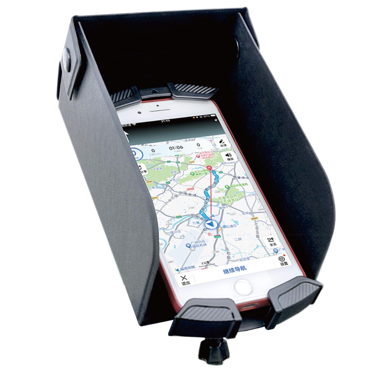 【晴雨兼用フードカバー】晴れの日は、フードカバーが直射日光を防ぎ、内側生地の光吸収マイクロファイバーは走行中でも地図などの画面の反射を防止して見やすくします。また急な雨でも防水素材のフードカバーがスマートフォンを保護してくれます。フードカバーは取り外せて折りたたむ事ができるので、コンパクトに収納できます