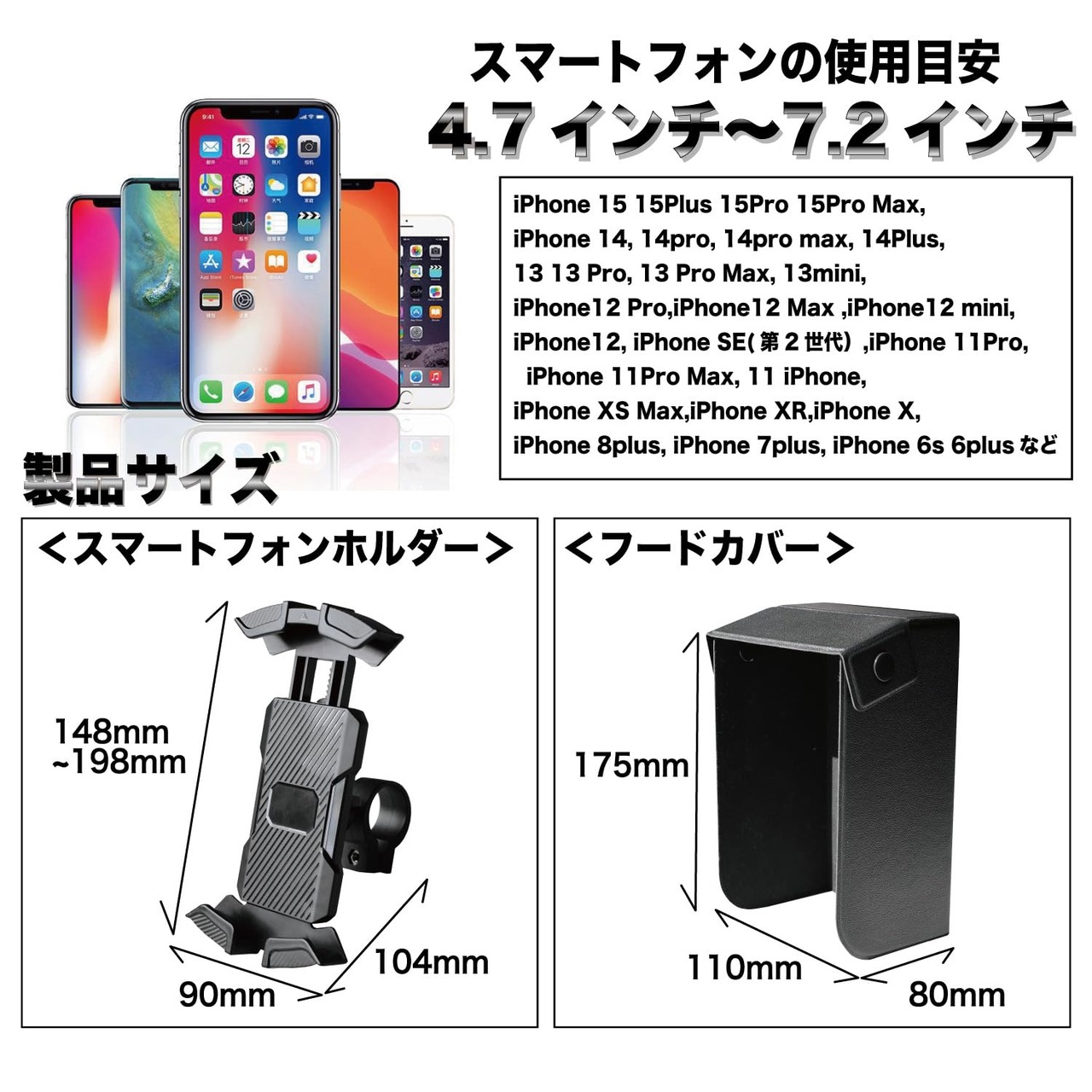 【スマートフォンホルダーは他機種に対応できます。】スマートフォンの使用目安は4.7インチ〜7.2インチです。対応機種::iPhone 15 15Plus 15Pro 15Pro Max, iPhone 14, 14pro, 14pro max, 14Plus, 13 13 Pro, 13 Pro Max, 13mini ,iPhone12 Pro, iPhone12 Max,iPhone12 mini, iPhone12, iPhone SE(第2世代),iPhone 11Pro, iPhone 11Pro Max, 11 iPhone,iPhone XS Max,iPhone XR,iPhone X,iPhone 8plus. iPhone 7plus, iPhone 6s 6plusなど。手帳型のケースには対応できませんので、ご注意ください。