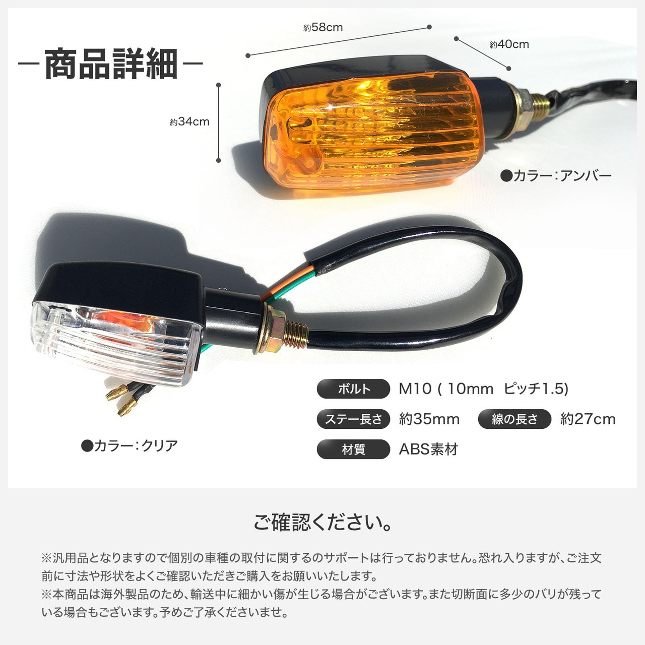 サイズ:ウインカー (縦:約58mm 横:約34mm 奥行き:約40mm) ボルト: M10 ( 10mm 1.5ピッチ) ステー長:約35mm 線の長さ:約27cm 材質:ABS