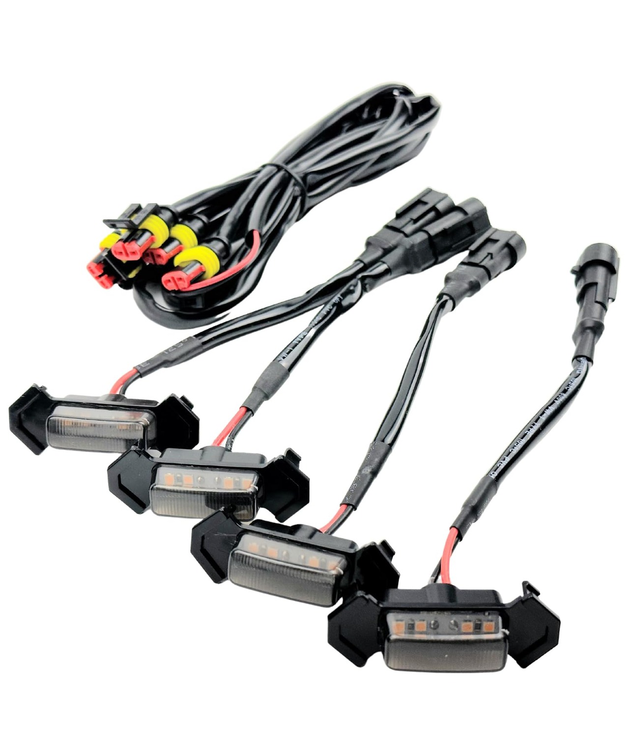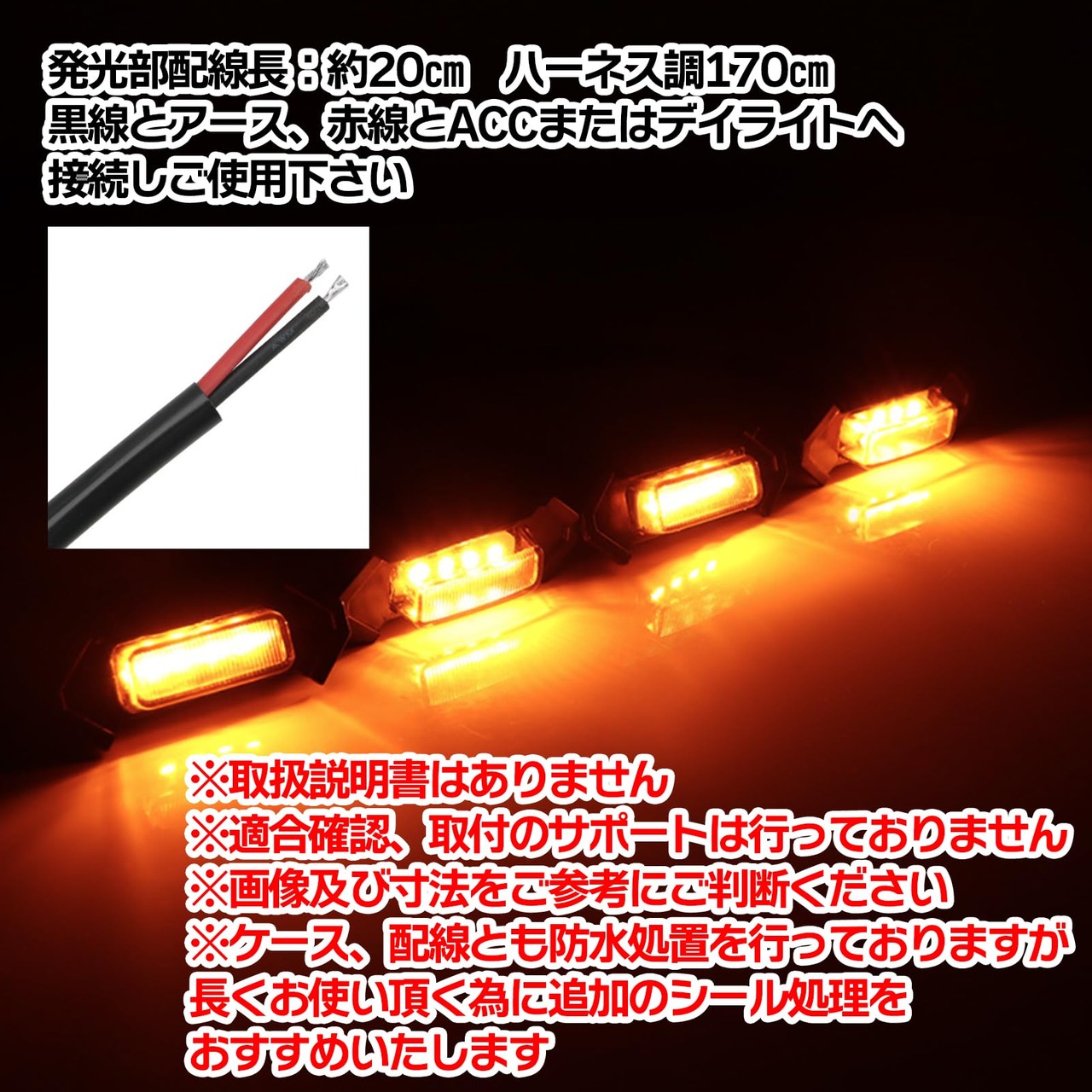発光部配線長(約20㎝)ハーネス調170㎝ DC 12V 黒線とアース、赤線とACCまたはデイライトへ接続しご使用下さい。ケース、配線とも防水処置を行っておりますが、長くお使い頂く為に追加のシール処理をオススメいたします。