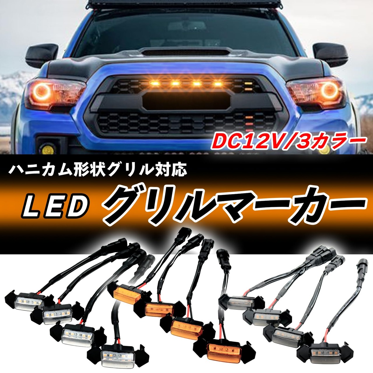 トヨタ タコマ TRD プロ ハイラックス グリルマーカーなど(グリルがハニカム形状の車種に取り付け可能)仕様電圧:DC12V、発光部材質:樹脂素材 取付部寸法:幅約61mm、高さ約24mm、発光部寸法:幅約34mm、高さ約13mm、レンズ出代約10mm