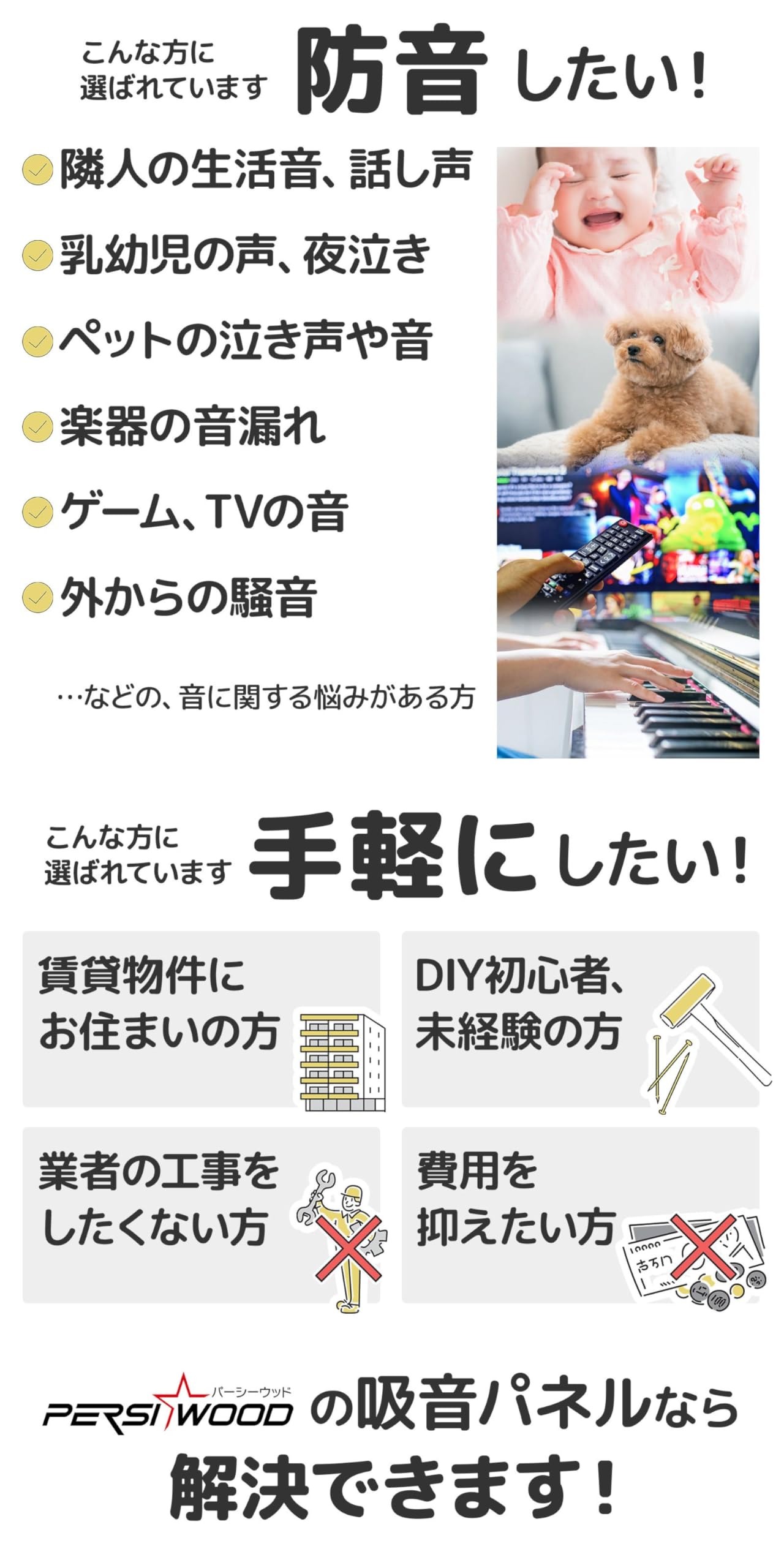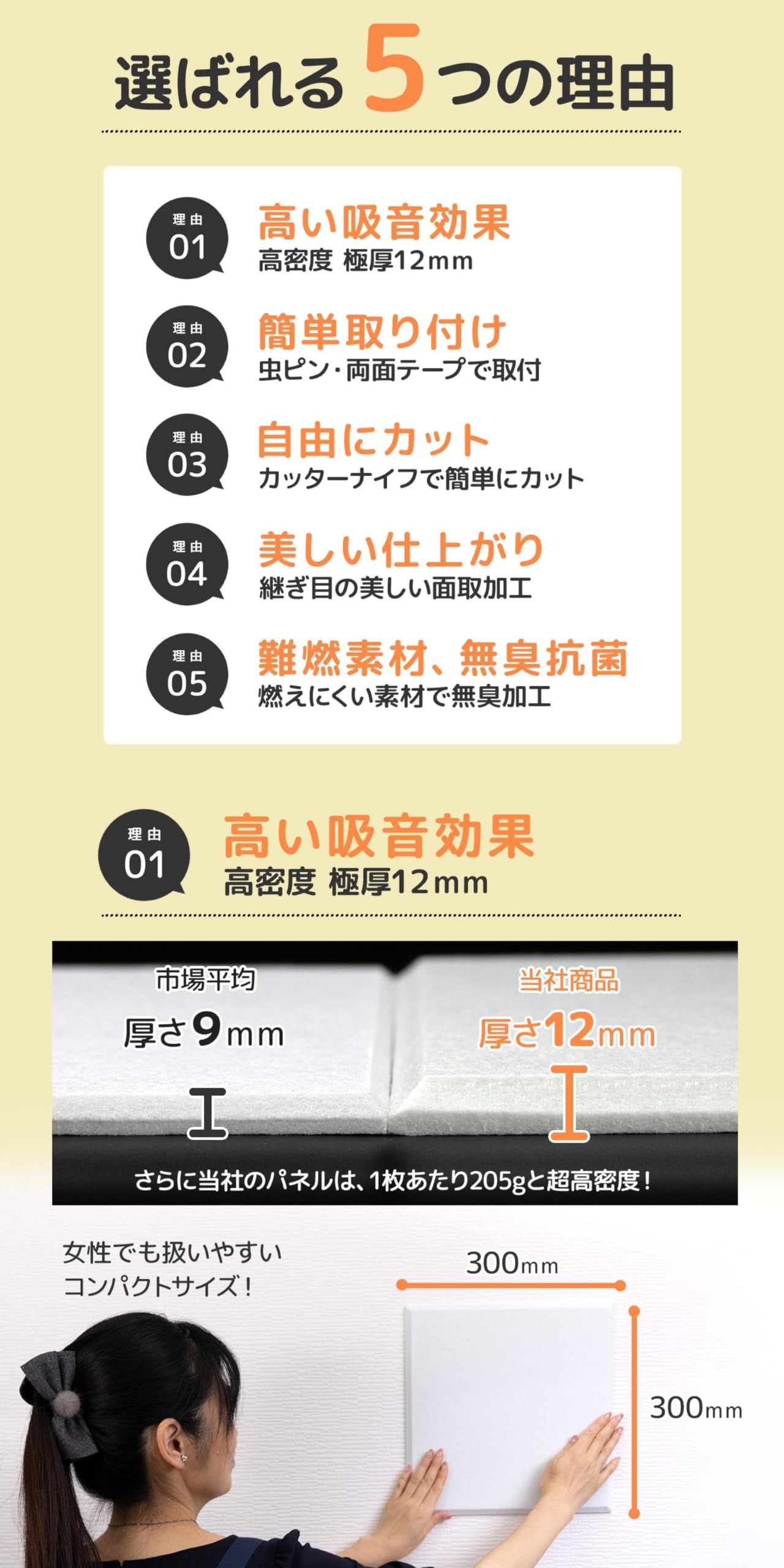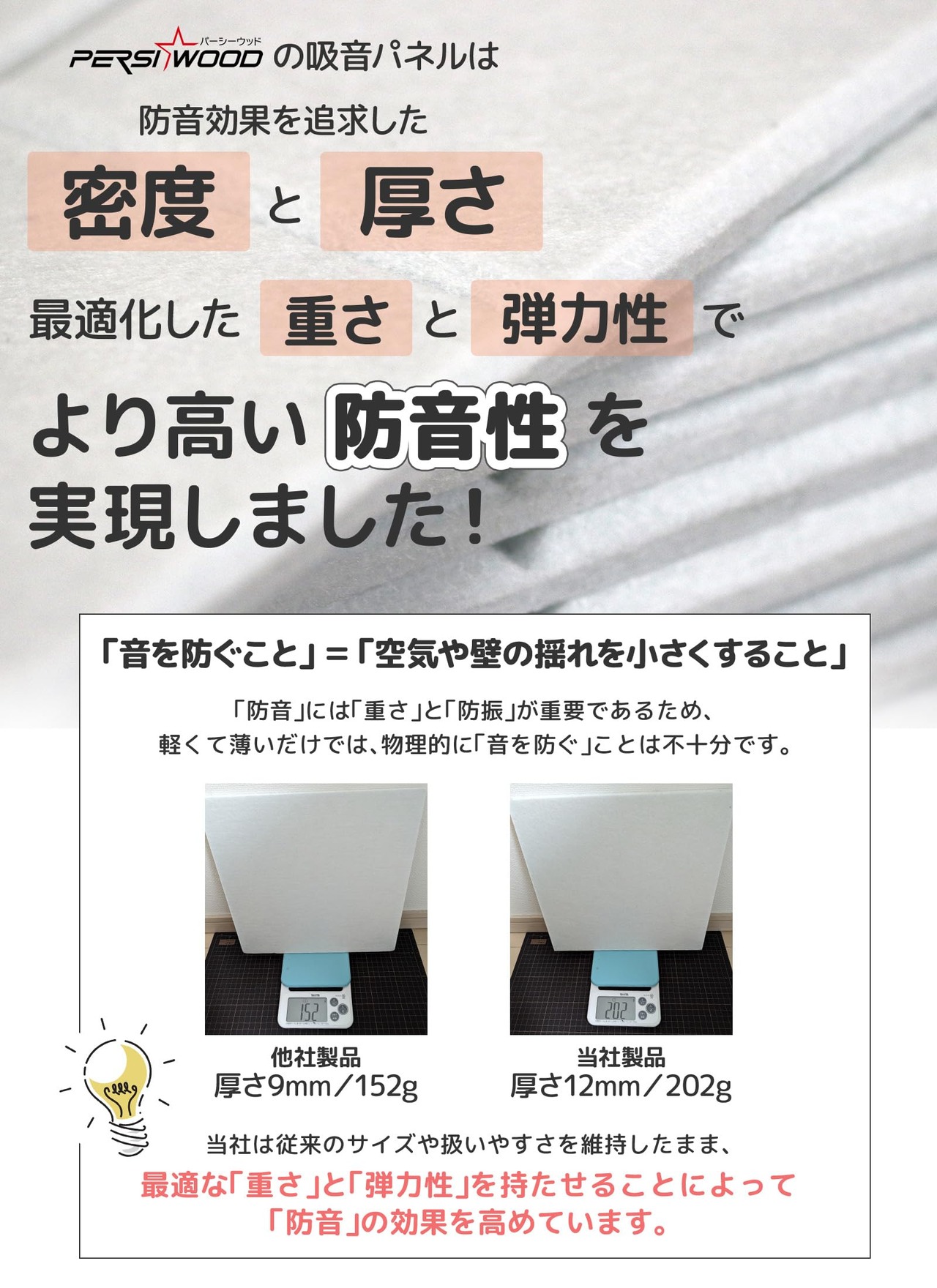 ●300mm×300mm 12枚セット ●不快な音を和らげるフェルトボードです。 ●うるさく感じる生活音を和らげる ●壁に貼ったり床に敷いたりするだけで不快な音を和らげる、吸音する高密度のフェルトボード。 ●テレビやオーディオ、楽器など音の発生源近くに貼り付けるだけの優れもの。 ●繊維を丹念に絡ませて高圧縮したフェルトボードは最上級の細かな品質を実現。 ●吸音 防音とは 防音には3つの基本要素があります。 ★遮音(音を伝えない・はね返す) ★吸音(音を吸収する) ★防振(壁など) 吸音パネルは吸音性のある材質を使っています。 空気の振動によって伝わる音は吸音材にぶつかるとその振動を吸収しはね返る音を少なくします。 こうして周りの雑音を和らげるのです。 100%ポリエステル製の繊維を高圧縮加工により高密度の板状に成形した硬質吸音フェルトボードは吸音材材として様々なところで利用されています。 さらに 不快に感じる音を特に和らげる 吸音パネルは人が不快に感じるとされる周波数で高い吸音率が見込まれます。 つまり 吸音パネルを音の発生源の近くに設置すれば、不快に感じる音を和らげてくれる。 吸音するパネルだから 壁などから反響する音も吸収してクリアな音に。 テレビの後ろに吸音パネルを設置するだけで音を吸収してくれるので簡単に音漏れを軽減。 室内の音の響きも調節出来ます。 重ねて使用で効果アップ 吸音パネルを2枚重ねにすると音を遮る性能をより発揮します。 床などへの衝撃音も吸収します 床への衝撃音など人間の生活音も低減させます。 椅子を引きずる音や小さな子供のドタバタ歩きの音も和らぎます。 床に敷く場合は両面テープ等で固定してください。 ●ローコスト 吸音パネルなら低コストも実現 工事などの必要なく、必要な部分だけの設置でOK! また子供が小さい時だけなどの一時的な設置や追加で設置などにもラクラク対応可能です。 低コストでこんな用途にも使えます。 ●クッション性もあるので壁面への保護材に ●音をよりクリアな音質に ●ポリエステルフェルトは断熱性にも優れています ●オフィス、静かに会話したい場所にも最適 設置におすすめの場所 住宅・マンション・スタジオ・楽器部屋・キッズルーム・幼稚園・オフィス・会議室・マンション・エントランス ●楽々取り付け 取付けは簡単 壁に貼ったり床に敷くだけ 女性でも簡単に設置していただけます。 基本は並べて貼るだけ カッターでの加工も可能 内装に合わせてピッタリ仕上げることもできます。 カッター等で加工可能 コンセントやスイッチなどの避けたい部分や設置幅に合わせて簡単に切り取れます。 虫ピンで取り付け チリ外し簡単で痕も目立ちません。 石膏壁におすすめです。 ホットメルトで取り付け 養生テープの上にホットメルトでの取り付けも可能です。 直接傷もつきません。 マジックテープで取り付け コンクリート壁などに有効。 付け外し可能な場合にもオススメです。
