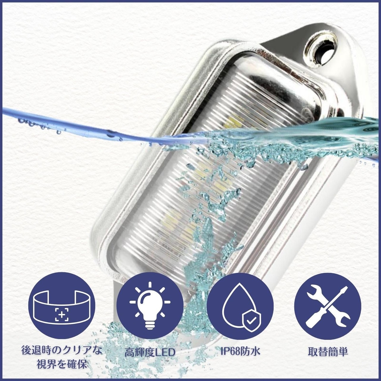 明るく輝くLEDメッキナンバープレートライセンス灯1個セットのご紹介です。白く美しい光でナンバープレートを照らし、車両の存在感を引き立てるアイテムです。12V / 24Vの両方に対応し、自動車やトラックなどあらゆる車種に取り付け可能です。6500Kの自然なホワイトカラーの光を放ち、夜間や暗い場所でのナンバープレートの可読性を高めてくれます。耐久性があり、長期間にわたり安定した明るさを保ちます。防水性能も備えているため、悪天候や水しぶきにも強く、信頼性のある製品です。おしゃれで高級感のあるデザインは、車の外観に絶妙なアクセントを与えます。暗い道路や駐車場などでの運転を安全にサポートし、他のドライバーにもアピールすることができます。このLEDメッキナンバープレートライセンス灯をぜひお試しください。車の魅力をさらに引き立て、安全かつ快適なドライビングをお楽しみいただけます。説明書は付属しておりません。比較的簡単に設置することできますが、取り付けは業者様にご依頼くださいますようお願いいたします。商品写真はできる限り実物の色に近づけるよう徹底しておりますが、 お使いのモニター設定、お部屋の照明等により実際の商品と色味が異なる場合がございます。※車種によっては取り付けが制約される場合がありますので、ご注意ください
