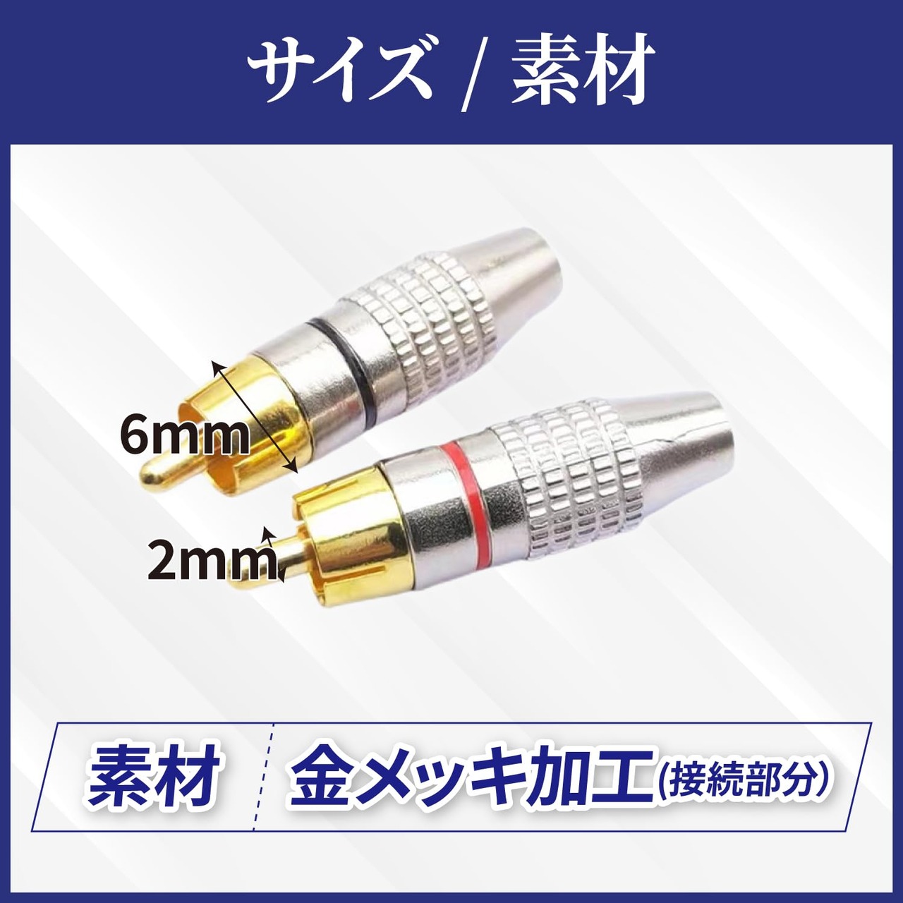 新たな次元へと誘う、高品質なRCAプラグ。バリエーションは8個、12個、24個の選択が可能で、赤と黒が半々に配置され、見た目にもこだわりました。自作オーディオケーブルに最適な金メッキ仕様。導電性と耐食性に優れ、信号のクリアで安定した伝送を実現します。芯線はネジ止め式で、はんだレスタイプなので、自作プロジェクトにも最適。再利用も容易で、手軽にカスタマイズが可能です。商品のサイズはコンパクトでありながら、10mm×42mmというしっかりとした存在感があります。軽量ながらも重厚感があり、最大外径Φ6mmで取り扱いもしやすいです。1個あたりの重量はわずか7gと、オーディオ機器への負担を最小限に抑えつつ、高い信頼性を保ちます。そして、赤+黒の2色セットがユーザーフレンドリーなデザイン。見た目にも美しさを追求し、オーディオ環境を一層引き立てます。プロ仕様の音質とエレガントなデザインを兼ね備えた、このRCAプラグで、新たな音楽体験をお楽しみください。