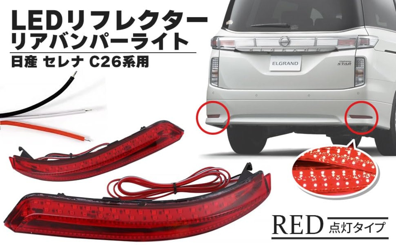 日産 セレナ C26系用 LED リフレクター リア バンパー ライト レッドレンズ 汎用 社外品になります。 <br><br> 適合車種:日産 セレナ C26系 XG X G ハイウェイスター C26 NC26 FC26 FNC26 2010年11月~ / <br> エルグランド E52系 TE52 TNE52 PE52 PNE52 2010年8月~ / ブルーバード シルフィー G11系 G11 NG11 KG11 2005年12月~ / <br> プレサージュ U31系 TU31 TNU31 PU31 PNU31 <br> 2003年6月~2008年7月 / ウイングロード Y12系 Y12 NY12 JY12 2005年11月~ 等 <br><br> 純正適合品番:右:26560-8990D/26560-EW00A 左:26565-8990D/26565-EW00A <br> レンズカラー:レッドレンズ セット内容:本体左右 配線:赤:スモール 白:ブレーキ 黒:アース<br><br> リアバンパーのリフレクターがスモールとブレーキライトとして使用できるようになります。<br><br> スモールやブレーキのランプが増えますので、夜間・悪天候時の視認性がアップします。<br><br> 純正リフレクターと同サイズに造られていますので、純正部品同様ポン付けの交換でピッタリフィットし周りに馴染んでくれます。<br><br> お車のドレスアップが趣味の方、カスタム好きな方にもお勧めのパーツです。<br><br> さりげなくリフレクターをカスタムしている車は、センスの良さを感じさせカッコよくなります。<br><br> DIY初心者の方でも取り付けが可能ですので、慣れている方なら簡単に設置が可能です。<br><br> お気に入りのパーツでカスタムするとドライブが楽しくなりますので、最初に手を入れるパーツとして取り付けしてみる事をお勧めします。<br><br> 大切な愛車のリフレッシュパーツとしても違和感なく取り付け可能ですので、ノーマルの雰囲気を壊したくない方にオススメのLEDリフレクターリアバンパー ライトです。<br><br> ※取扱説明書は付属しておりません。<br><br> ※取り付けに関するサポート及びお問い合わせの対応はしておりませんのでご了承お願い致します。<br><br> ※取り付けに自信のない方は専門の業者様、または整備士に依頼して取付けされることをお薦め致します。<br><br> ※取り付け可能車種の質問等にはお答えできませんのでご了承お願い致します。<br><br>