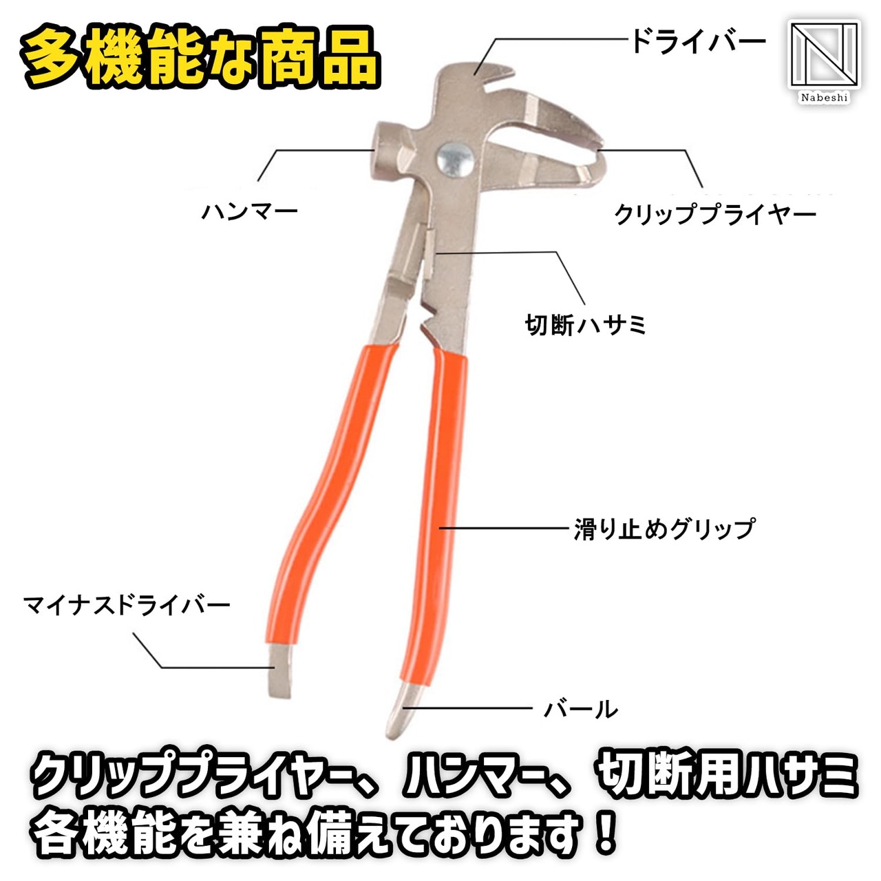 【多機能】多機能な商品となっており、クリッププライヤー、ハンマー、切断用ハサミの機能を兼ね備えております!
