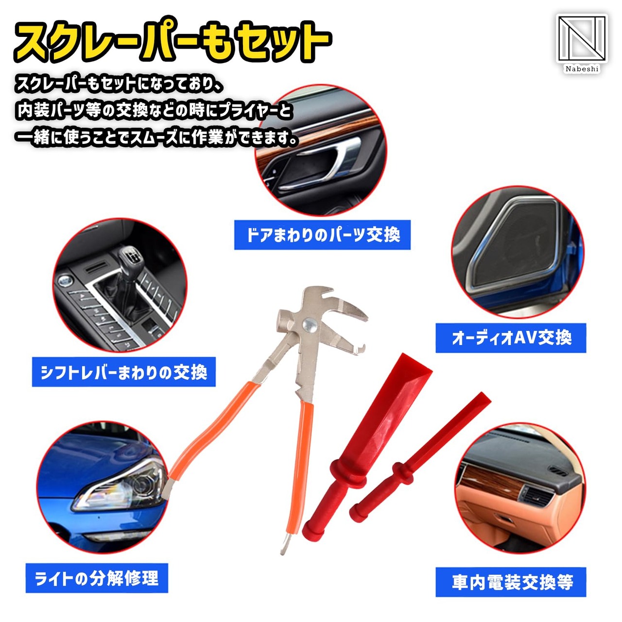 【スクレーパーもセット】スクレーパーもセットになっており、タイヤ交換などの時にプライヤーと一緒に使うことでスムーズに作業ができます。