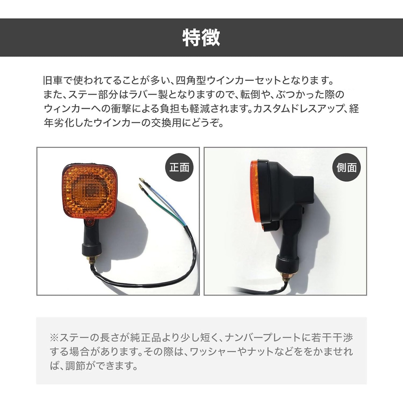 特徴:旧車で使われてることが多い、四角型ウインカー左右セットとなります。また、ステー部分はラバー製となりますので、転倒や、ぶつかった際のウィンカーへの衝撃による負担も軽減されます。カスタム・ドレスアップ・経年劣化したウインカーの交換用にどうぞ。※ステーの長さが純正品より少し短く、ナンバープレートに若干干渉する場合があります。その際は、ワッシャーやナットなどををかませれば、調節ができます。
