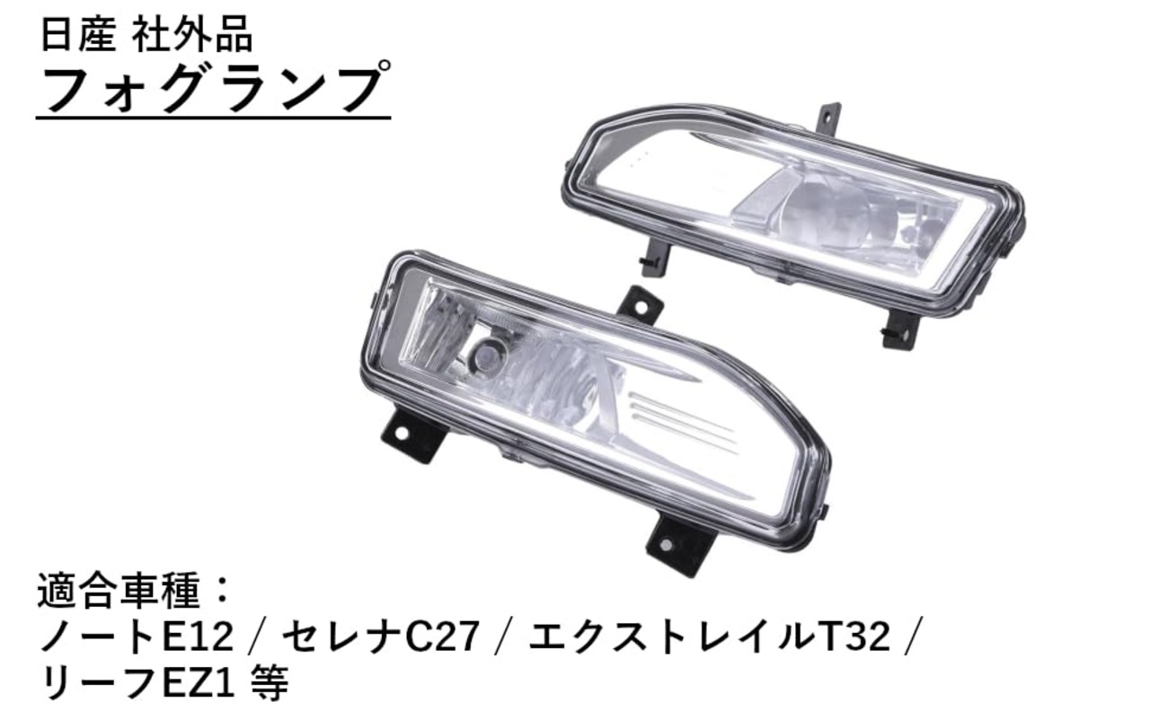 純正タイプ フォグランプ ノート E12 本体 左右セット の社外品になります。<br><br> 適合車種:ノートE12 / セレナC27 / エクストレイルT32 / リーフEZ1 等 <br> サイズ(約):純正同サイズ バルブ:H8-12V-35W <br> セット内容:フォグランプ左右セット<br><br> 純正フォグランプを障害物に接触させて破損させてしまった、飛び石での傷や経年劣化で黄ばんでしまった時の修理、補修部品としてお使い頂けます。<br><br> 純正オプションパーツでフォグランプを選択しなかった、中古車を購入したがフォグランプが装備されていなかった方でどうしても欲しいと思いの人にもオススメのパーツです。<br><br> フォグランプ左右セットで、リーズナブルな価格でご提供させて頂きます。(フォグランプ非装着車は別途リレー、スイッチが必要です。)<br><br> 濃霧、風雪、雨天等の悪天候で視界が悪い状況では、フォグランプの点灯は視界確保はもちろんですが対向車にこちらの存在を知らせるという意味でも大切な役目を果たします。<br><br> 街頭の無い道路でもヘッドライトではカバーできない所、近距離を広範囲に照らす事により路肩やセンターラインが見やすくなり安全面にも貢献します。<br><br> 消灯時でもフォグランプが取り付けられていると、見た目もカッコよくなり満足感が得られます。<br><br> 高額なメーカー純正部品を用意して交換される方が多いと思いますが、高品質のリーズナブルな社外品でコストを抑える事が可能です。<br><br> より安全に夜間のドライブが楽しめるようになります。<br><br> フォグランプが付いていなくてもしかたないか…と諦める前に純正パーツと見た目も機能も遜色のないフォグがお勧めです。<br><br> ※車両により個体差のある場合がありますので、取り付けに加工を要する事があります。<br><br> ※適合車種以外に流用される場合、質問等にはお答えできませんのでご了承お願い致します。<br><br> ※取り付けに自信のない方は専門の業者様、または整備士に依頼して取付けされることをお薦め致します。<br><br>