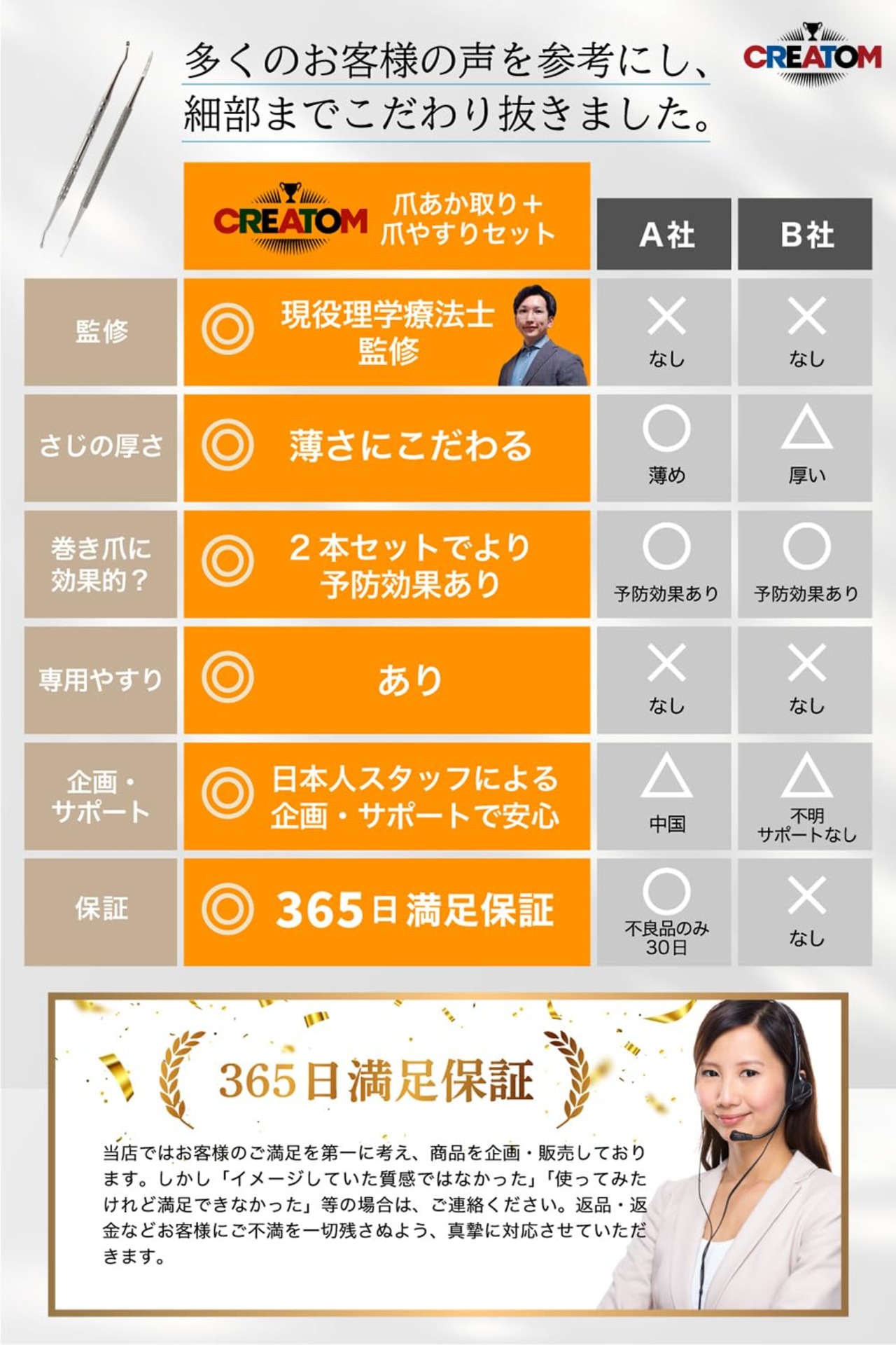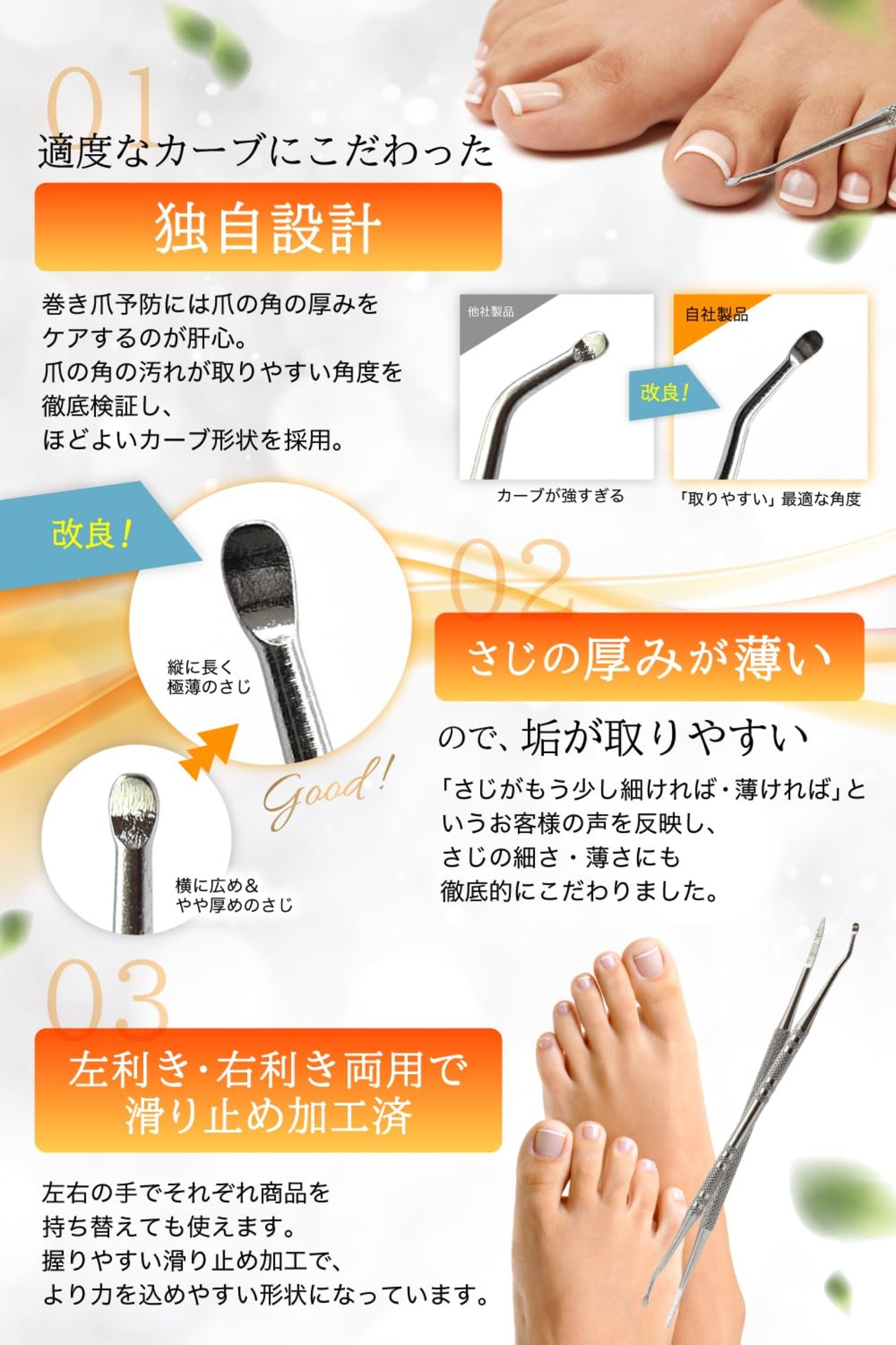 ✅【足の悩みのプロ、理学療法士が監修】CREATOMの爪垢取りは、多くのお客様の足のトラブル解消のお手伝いをされてきた理学療法士の中野亮先生が監修。たくさんの爪あかを取ることができ、また専用やすりとの二本使いが巻き爪対策にとても有効であるとお墨付きをいただいています。 ✅【爪垢がたくさん取れる角度を追求し、独自のカーブ設計を実現】爪あか取りはたくさん出回っていますが、カーブが強すぎるものがとても多く、使ってみると爪と指の間に深く入らず、力が入れづらい、というお声が多くありました。CREATOMでは研究を重ね、たどり着いた独自のカーブ設計により、無理なく爪と指の間にスッと入る角度を実現しました。 ✅【さじの幅と薄さで、取れる爪垢の量が変わる】CREATOMの爪垢とりはさじの薄さだけでなく、幅にもこだわりをもって開発しました。厚みがあったり幅が広めだと、取れる爪垢の量が少なくなってしまいます。爪垢が溜まっているのが見えるのに取れない…。そんな声も多く、CREATOMでは何度も検証を重ね、取りやすい薄さ、幅を追求し、厚すぎず薄すぎない厚み、広すぎず狭すぎない幅の設計に尽力しました。 ✅【専用の爪やすりで厚くなった爪をやさしく削る】さじだけでは取り切れない細かな部分の汚れは、先の尖った部分で簡単に取ることができます。また、やすり部分で爪の内側を削ることもできるので、爪切りのやすりではとれない爪の厚み部分や、爪の角を整えるのにも大いに役立ちます。ネイルケアや甘皮処理に使うこともできます。 ✅【日本人スタッフの安心サポートと満足保証】日本人による企画・販売で365日の長期満足保証付きだから安心。気になることがございましたらいつでもご連絡ください。日本人スタッフが誠心誠意対応させていただきます。