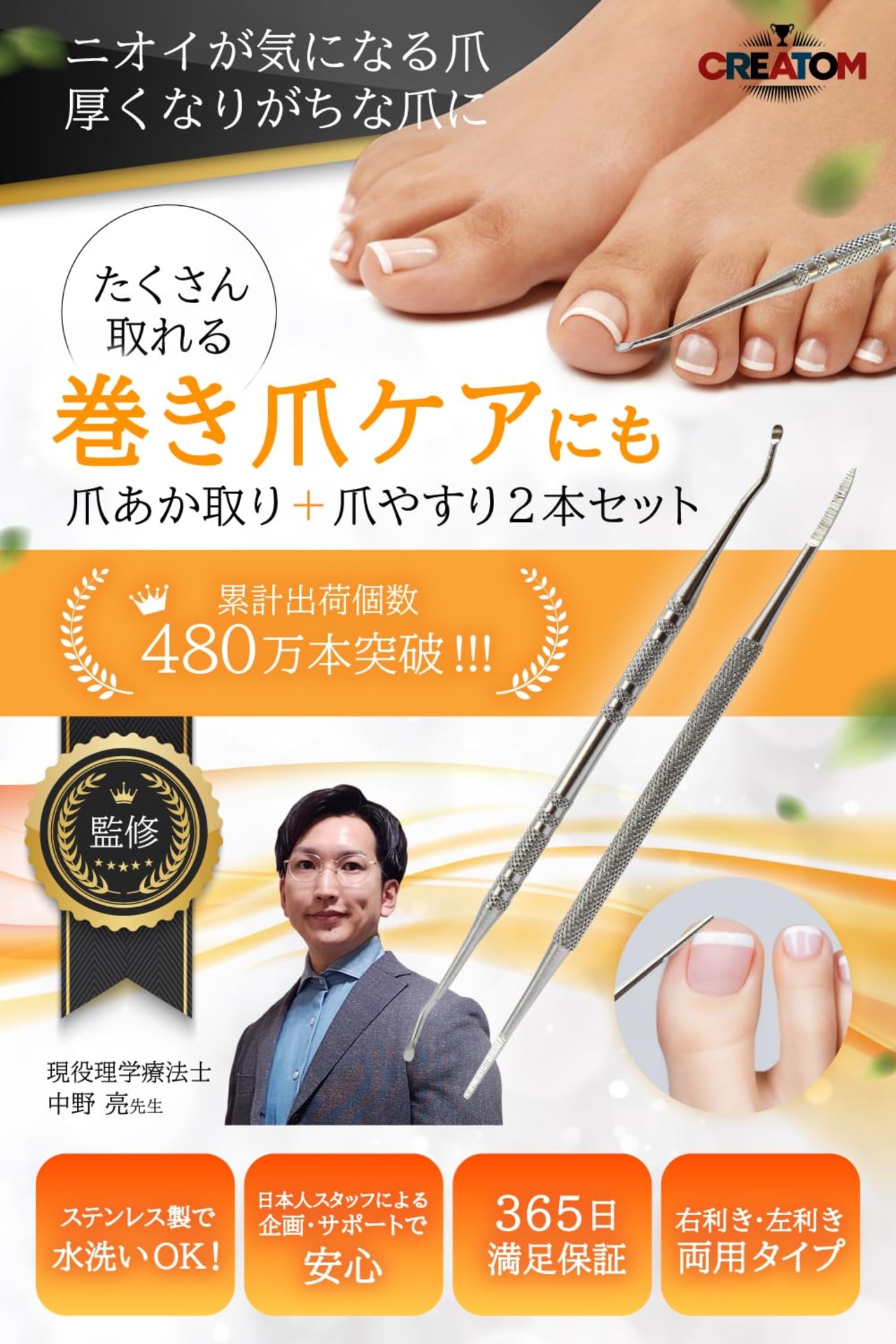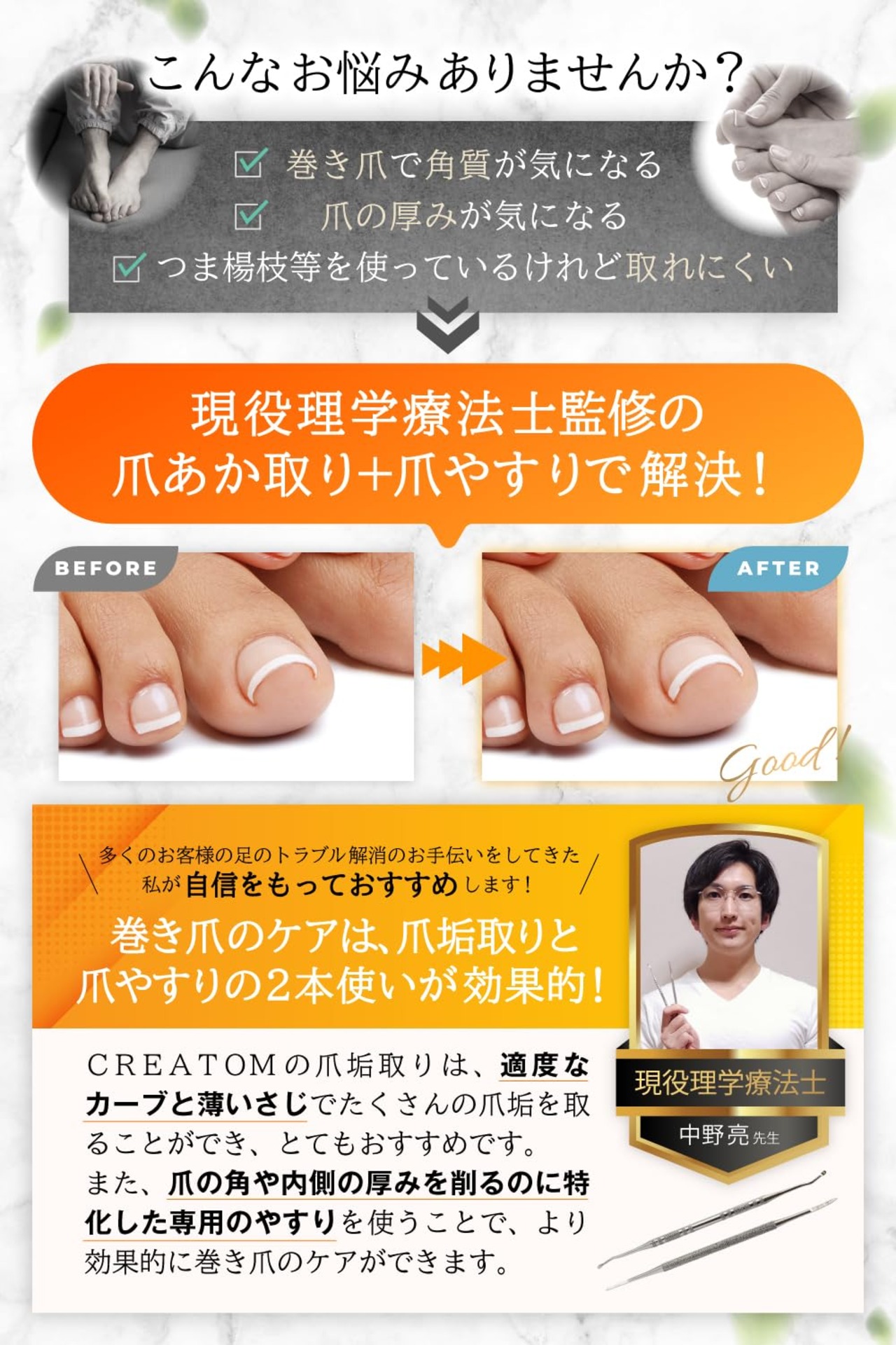 ✅【足の悩みのプロ、理学療法士が監修】CREATOMの爪垢取りは、多くのお客様の足のトラブル解消のお手伝いをされてきた理学療法士の中野亮先生が監修。たくさんの爪あかを取ることができ、また専用やすりとの二本使いが巻き爪対策にとても有効であるとお墨付きをいただいています。