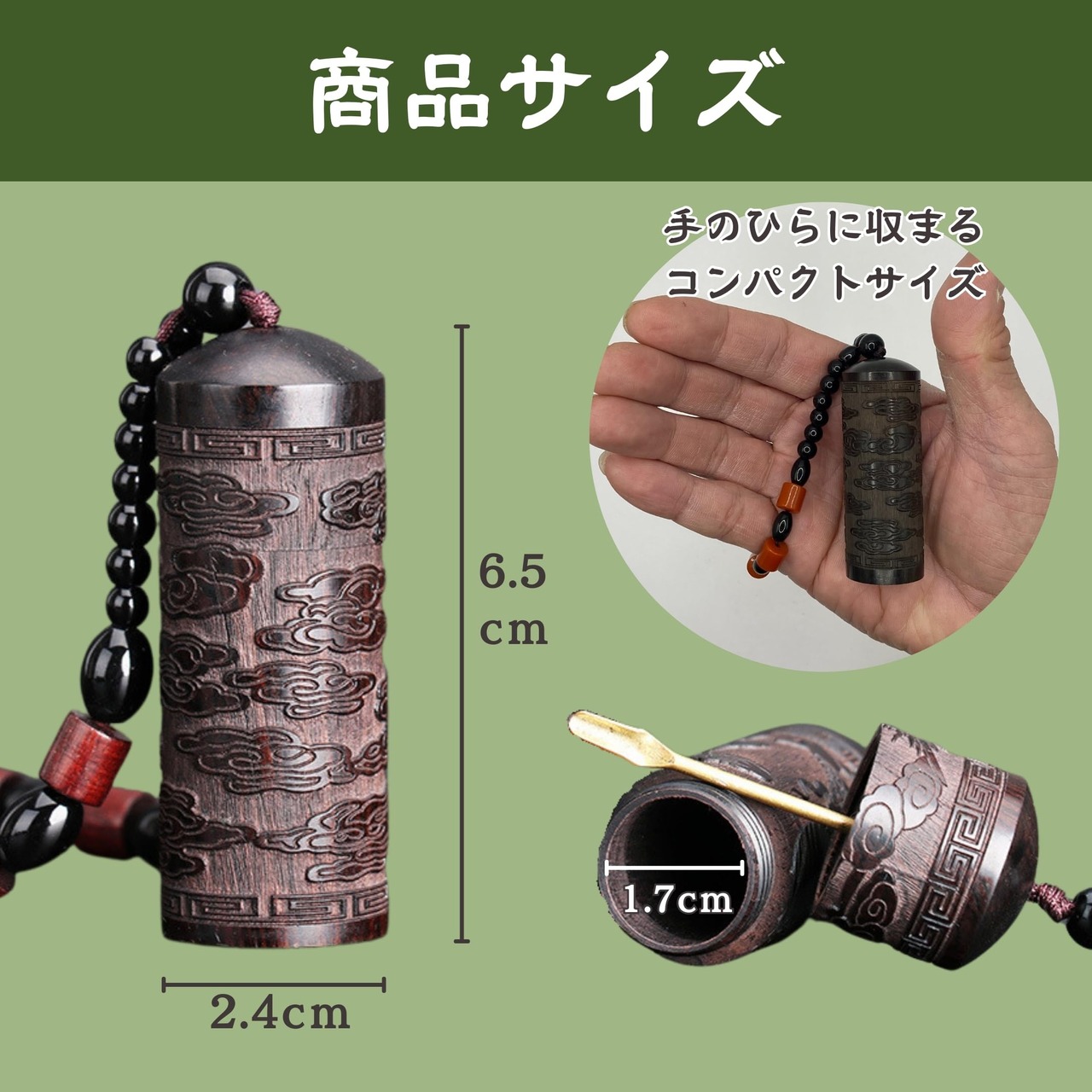 [HYmish]塗香入れ 薬さじ付き 直径2.4cm塗香 薬さじ付き コンパクトサイズ 参拝 巾着付き 黒檀 ストラップ付き 盤龍