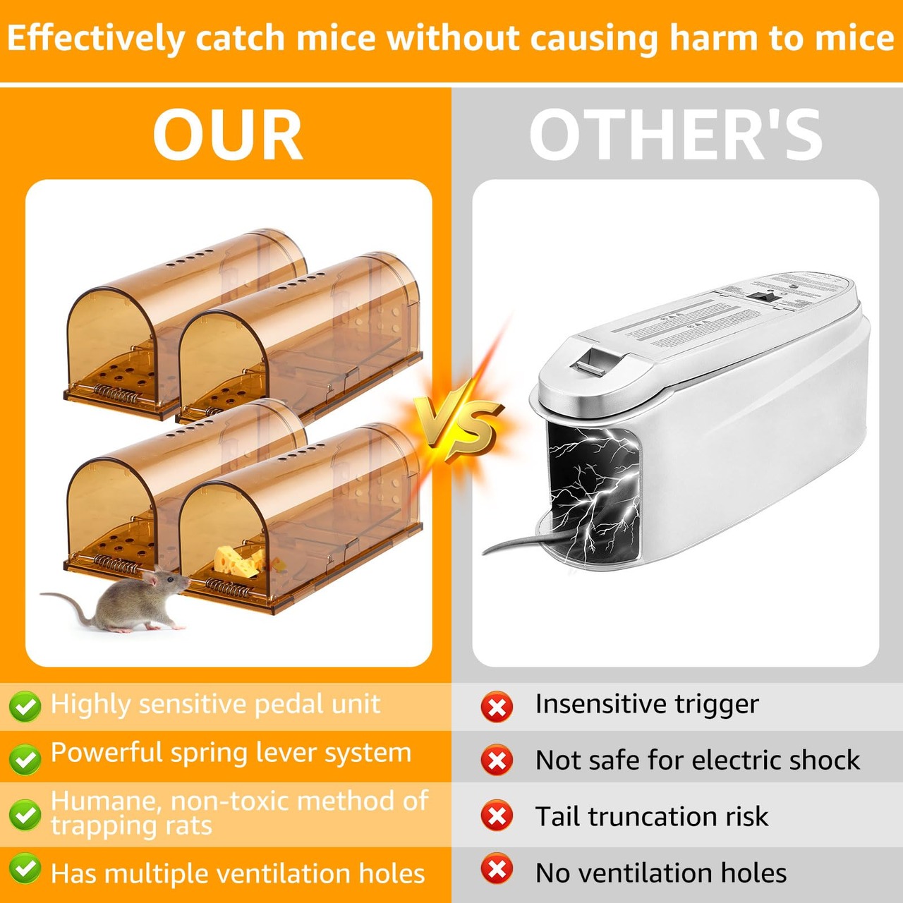 <p>【使用の原則】ネズミ捕り敏感な足踏み装置と強力なスプリングのレバーシステムを使用して、足踏み板に乗るだけで自動的にドアが閉まります。一度ネズミが箱に入り、足踏み板に触れると、装置が作動し、ネズミを捕獲するため、ネズミは逃げることができません。また、清潔で簡単に使用することができます。</p> <p>【ネズミ捕り使用方法】老鼠が隙間から逃げ出さないように注意してください!誘引剤を設置し、蓋を開けるだけで簡単に使用できます。誘引剤を誘引剤ボックスに入れ、ペダルとドアを装着し、よく出没する場所に置いてください。</p> <p>【抓して殺さない】ネズミ捕りの一種であり、粘着テープ、毒餌、罠とは異なり、動物にとって無害で、傷つけずに生きたまま捕獲できるため、誰でも簡単に使用できます。電気、毒薬、化学薬品は不要です。子供やペットのいる家庭におすすめです。</p> <p>【使用材料】老鼠に噛み破られるのを防ぐために、強く透明なABSプラスチック素材を使用し、穴の数を減らしました。</p> <p>【サイズ】4個のネズミ捕りのサイズ(約):17.3cm×6.2cm×6.5cm、重量(約):550g。全長17cmで、「最大15cm」の長い尾を持つネズミでも捕獲できますので、今回は逃げられません。何かご質問があれば、お気軽にお問い合わせください。</p>