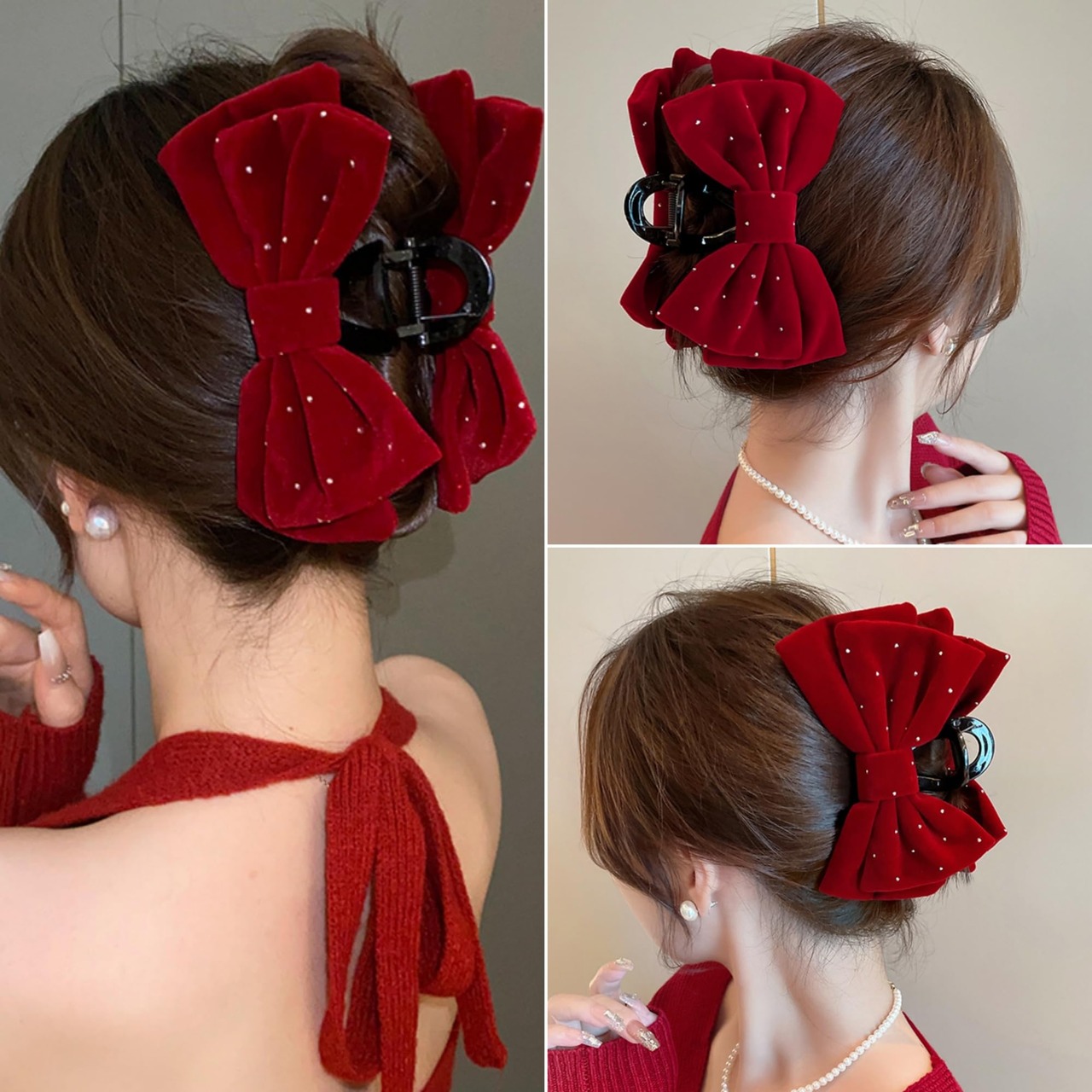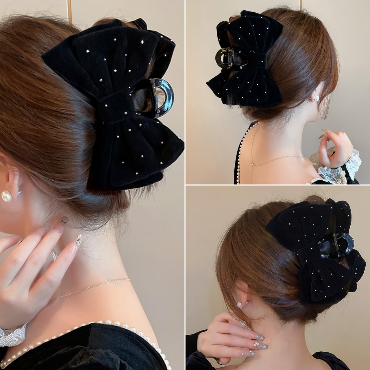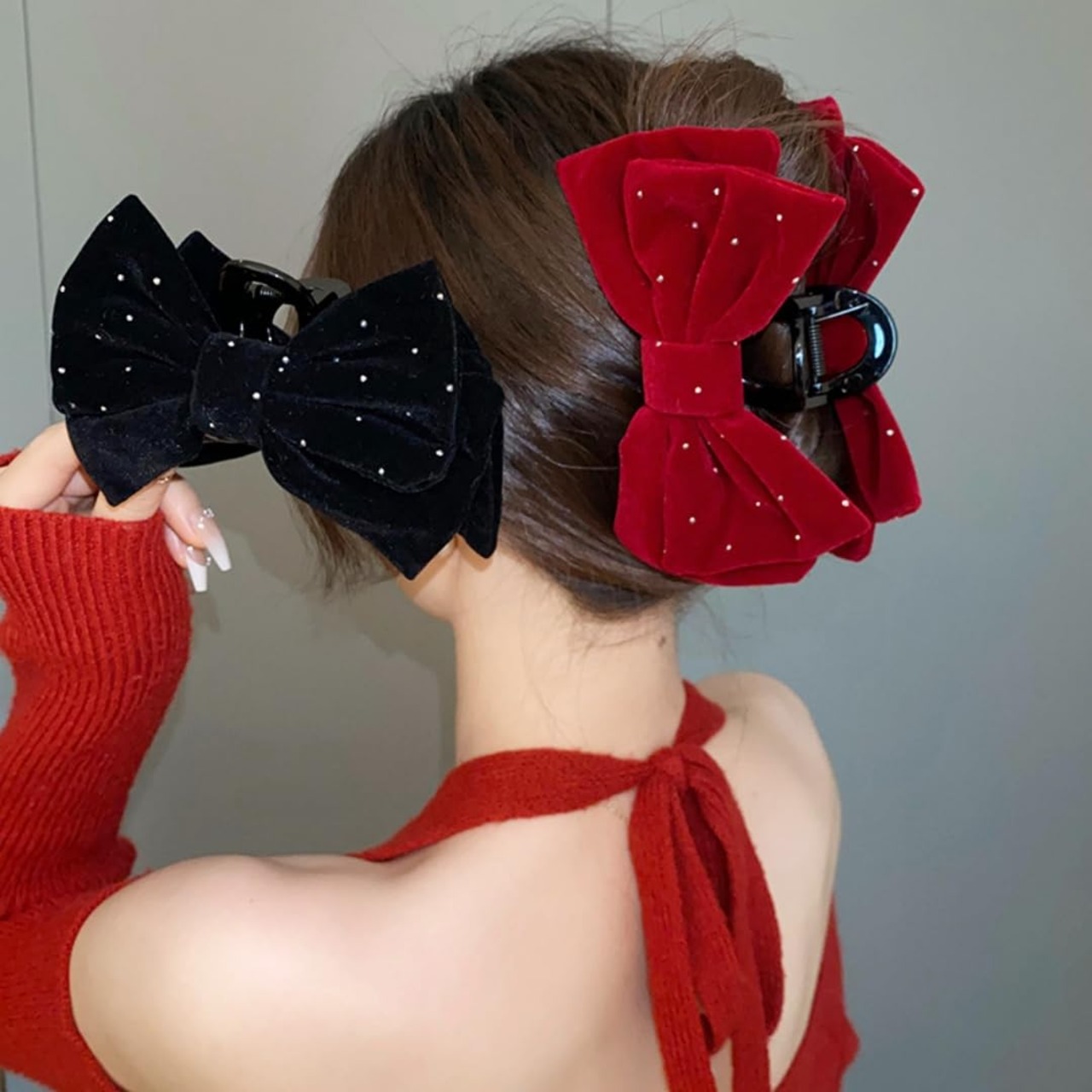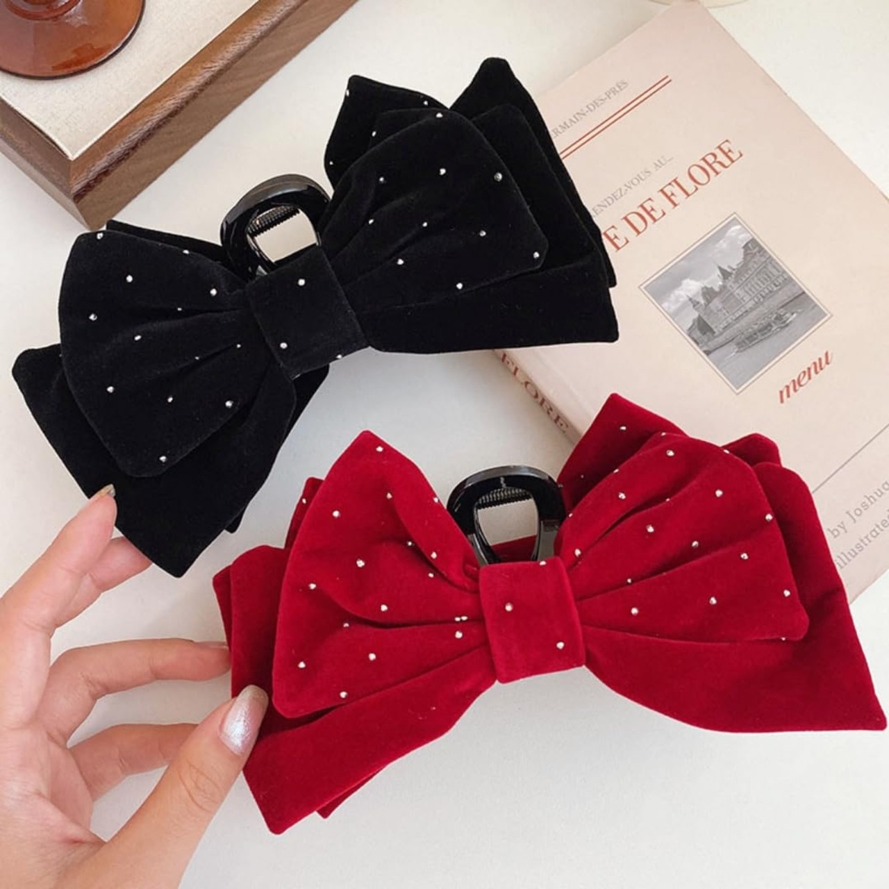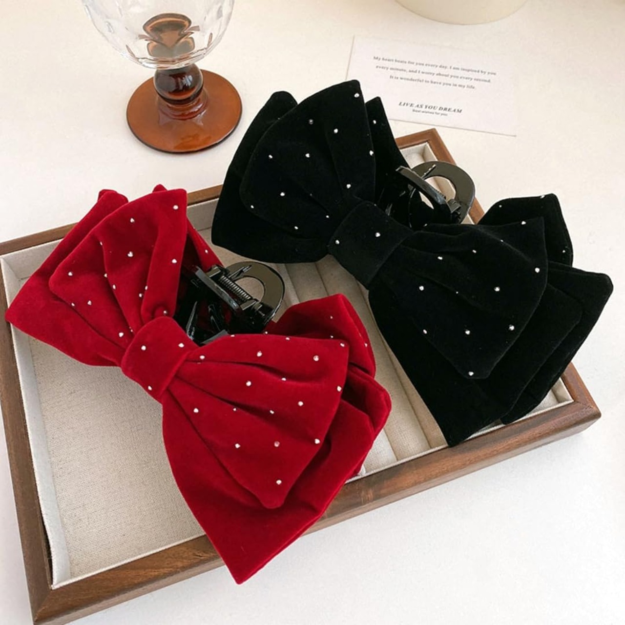 大きなリボンヘアクリップ レディース 大きなリボンクリップ ラインストーン ノンスリップ ジョークリップ 女の子用 ベルベット リボン ヘアクリップ バレッタ パーティー用ヘアアクセサリー (2個パック)