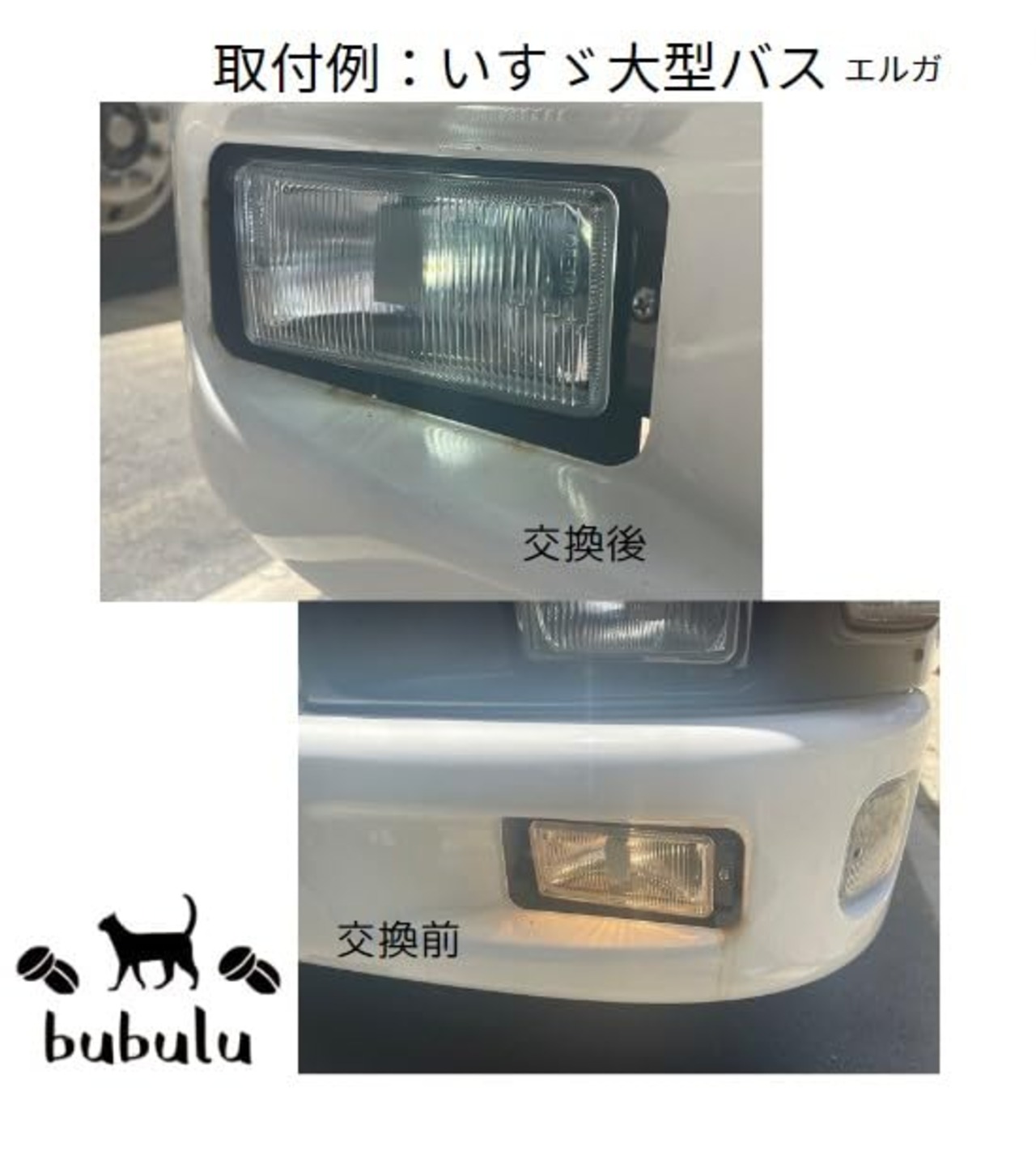 H3仕様24Vのトラックやバスのフォグランプにも対応しております(画像参照)。交換作業自体は簡単ではありますが交換作業に不安な方は最寄りの整備工場などで交換作業をおススメします。