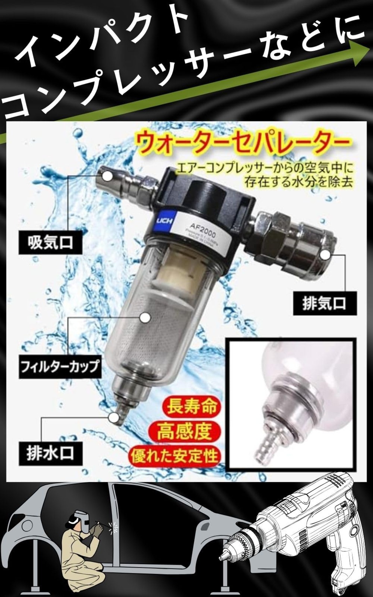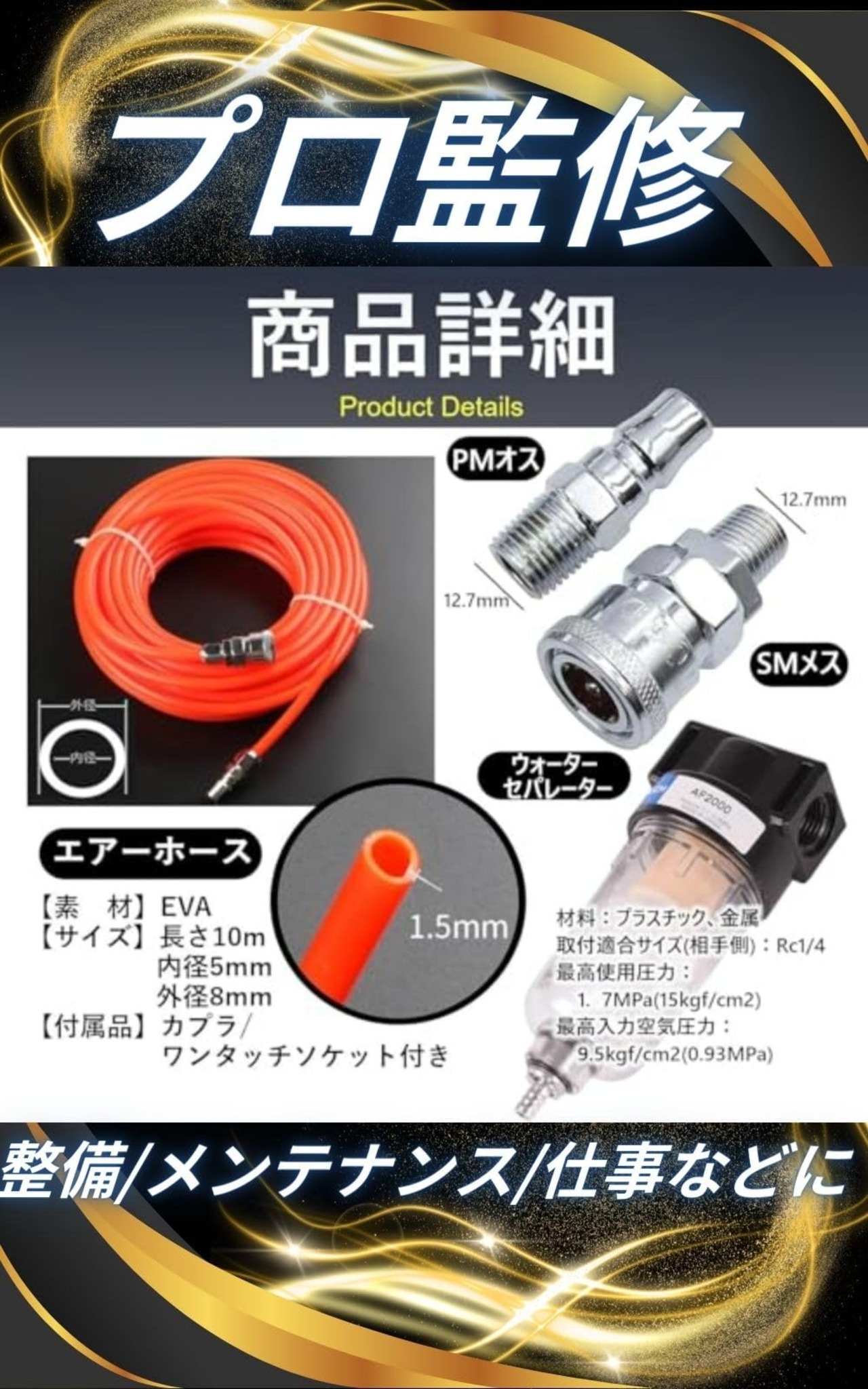 こちらのエアー工具用ホースとエアーコンプレッサー水分除去フィルターのセットは、水分除去用・エアーフィルターの 清掃・水飛ばし・車の埃や水滴飛ばし・エアブロー・バフ掃除用・エアーコンブレッサーとエアーツールの間に接続し、圧縮空気から発生するドレン(水滴)を空気と水に分離するセパレーターです。