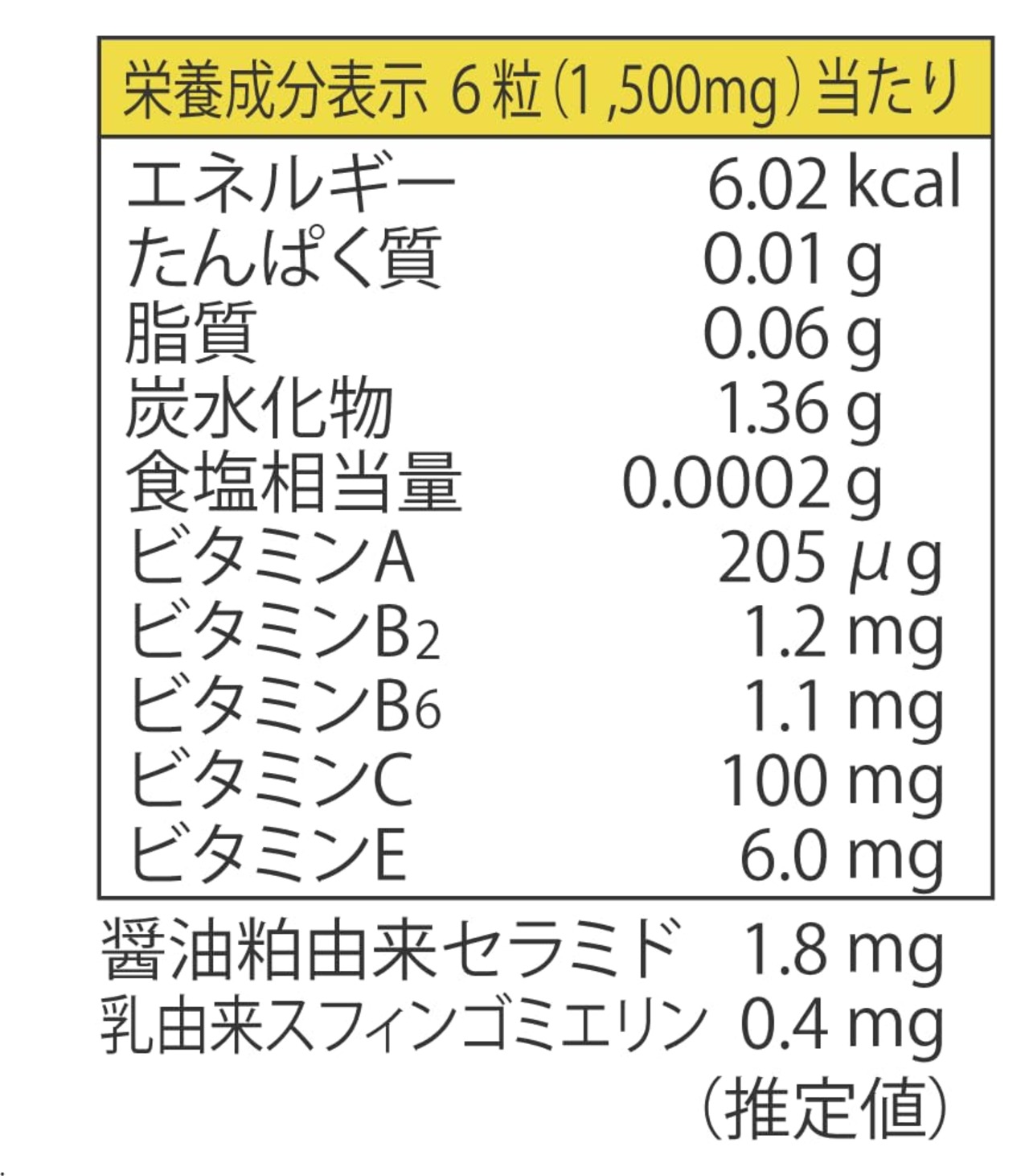 栄養成分表示 栄養成分表示 6粒(1500mg)当たり: エネルギー 6.02kcal 、たんぱく質 0.01g 、脂質 0.06g 、 炭水化物1.36g 、食塩相当量0.0002g 、ビタミンA 205μg 、ビタミンB2  1.2g 、ビタミンB6   1.1mg 、ビタミンC 100mg ビタミンE  6.0g 、醤油粕由来セラミド 1.8mg 、乳由来スフィンゴミエリン 0.4mg   (推定値)