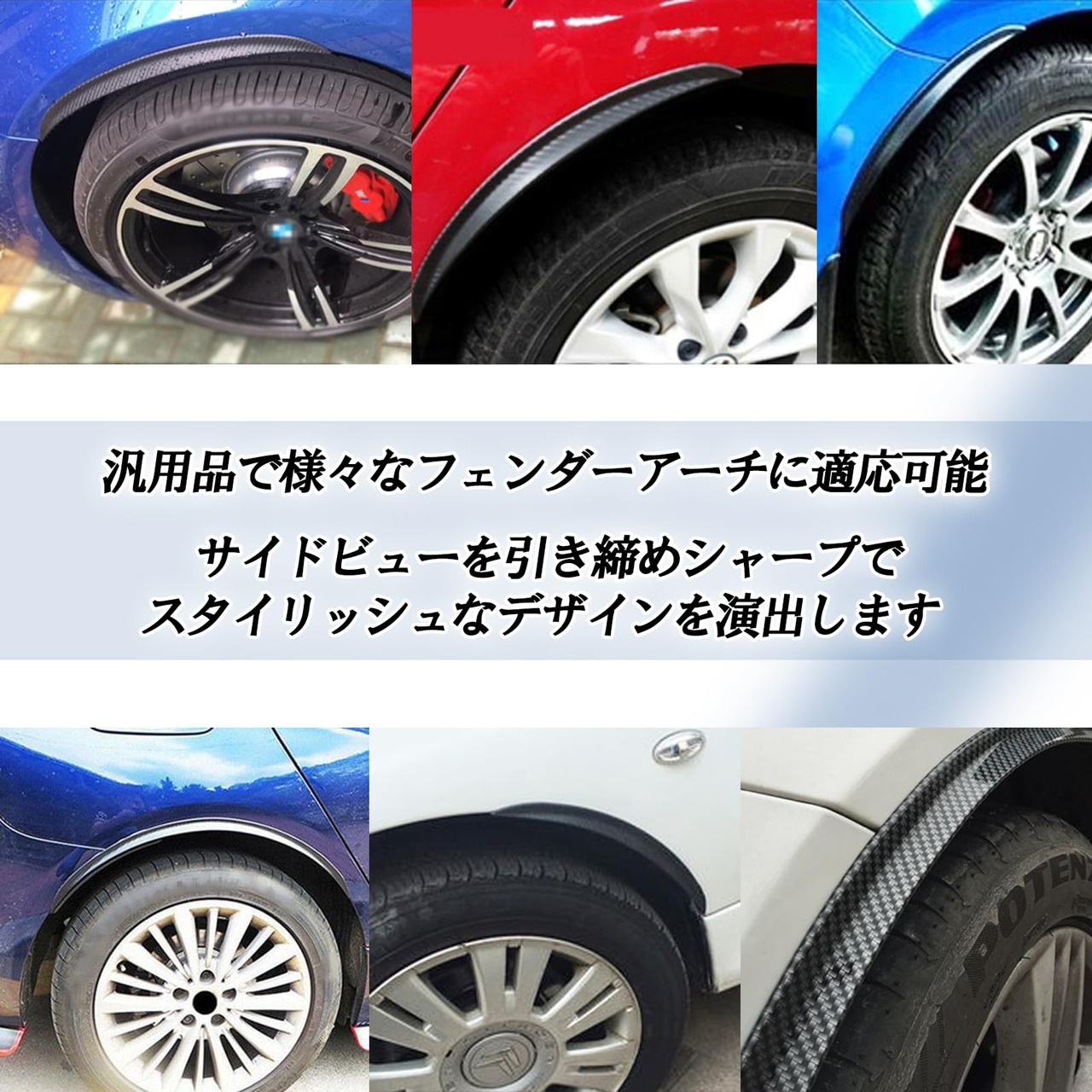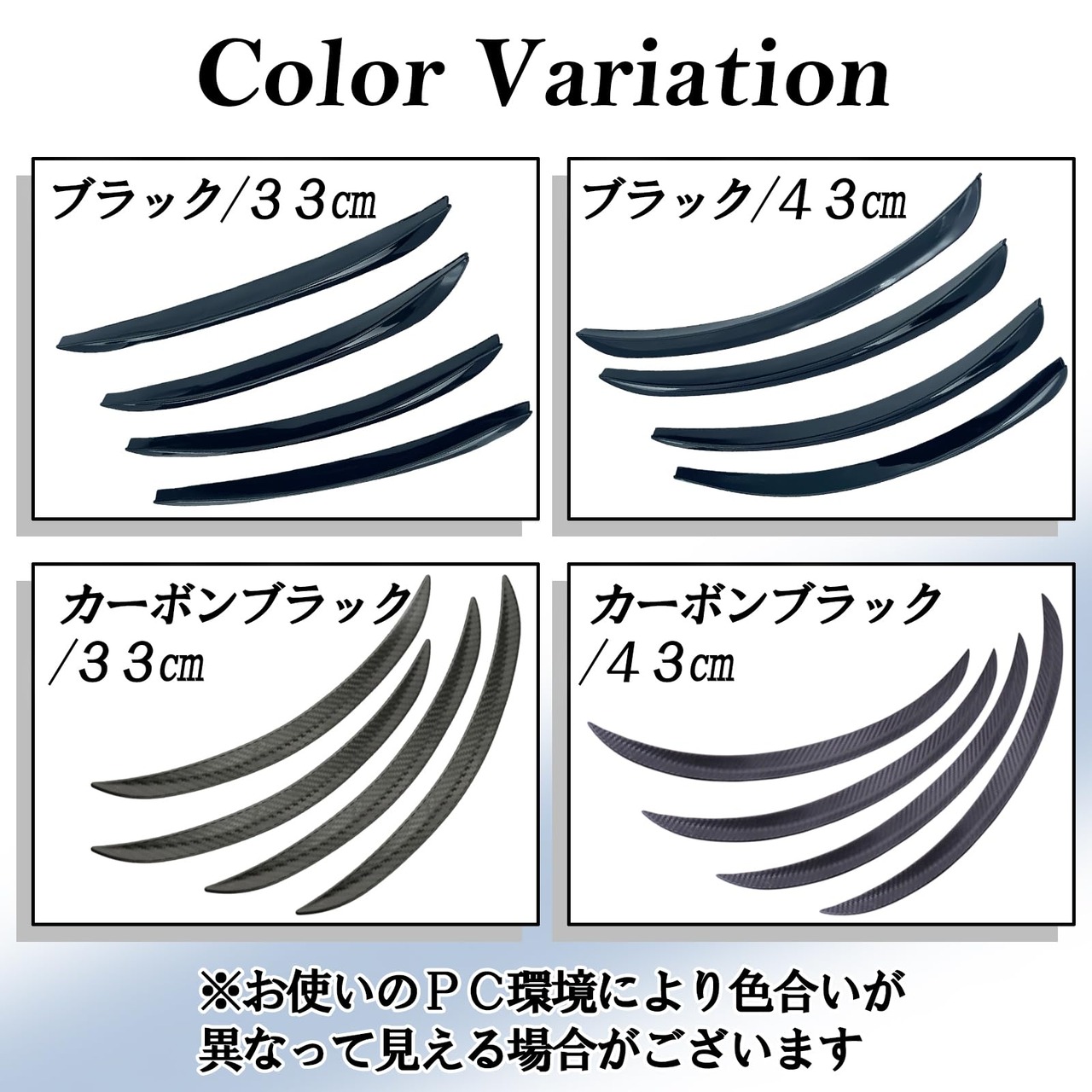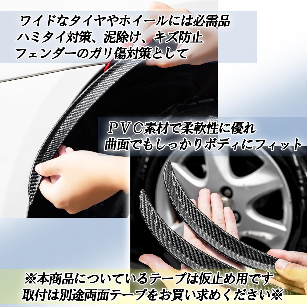 【商品概要】タイヤ周りのドレスアップしながらタイヤ、ホイールのトラブルを解決!オーバーフェンダーモール4本セットです。 ※必ず汚れを拭き取って脱脂してからお取り付けください。 【幅広い用途】ワイドなタイヤやホイールには必需品。ハミタイ対策、泥除け、フェンダーのガリ傷対策、キズ防止としてお使いいただけます。 【素材】PVC素材で柔軟性に優れているので、曲面でもしっかりボディにフィットしてドレスアップいただけます。 【ドレスアップ】様々なフェンダーアーチ合わせ、サイドビューを引き締め、シャープでスタイリッシュなデザインを演出します。 【バリエーション】横幅33cmブラック(黒)、横幅43cmブラック(黒)、横幅33cmカーボン調、横幅43cmカーボン調からお選びいただけます。 ※硬くなってる場合は、ドライヤーなどで温めてからお取付けください。