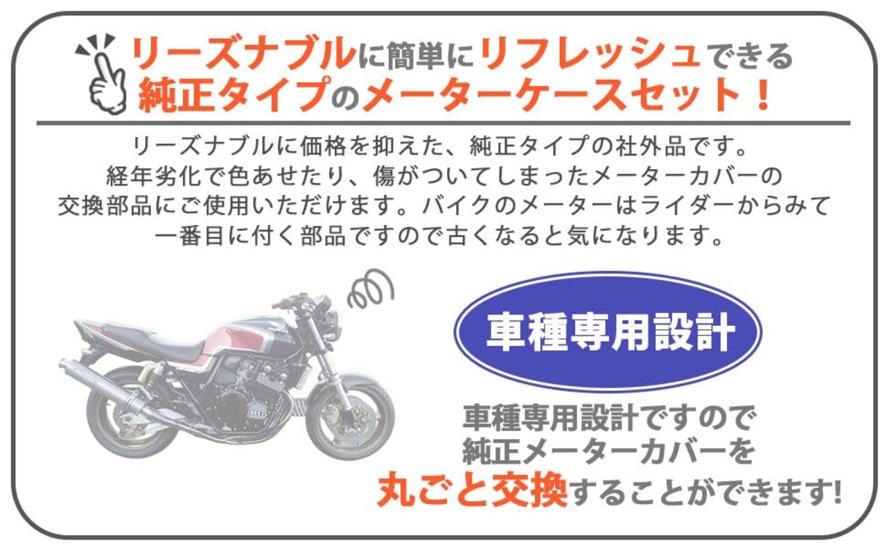 リーズナブルに価格を抑えた、純正タイプの社外品です。経年劣化で色あせたり、傷がついてしまったメーターカバーの交換部品にご使用いただけます。バイクのメーターはライダーからみて、一番目に付く部品ですので古くなると気になります。