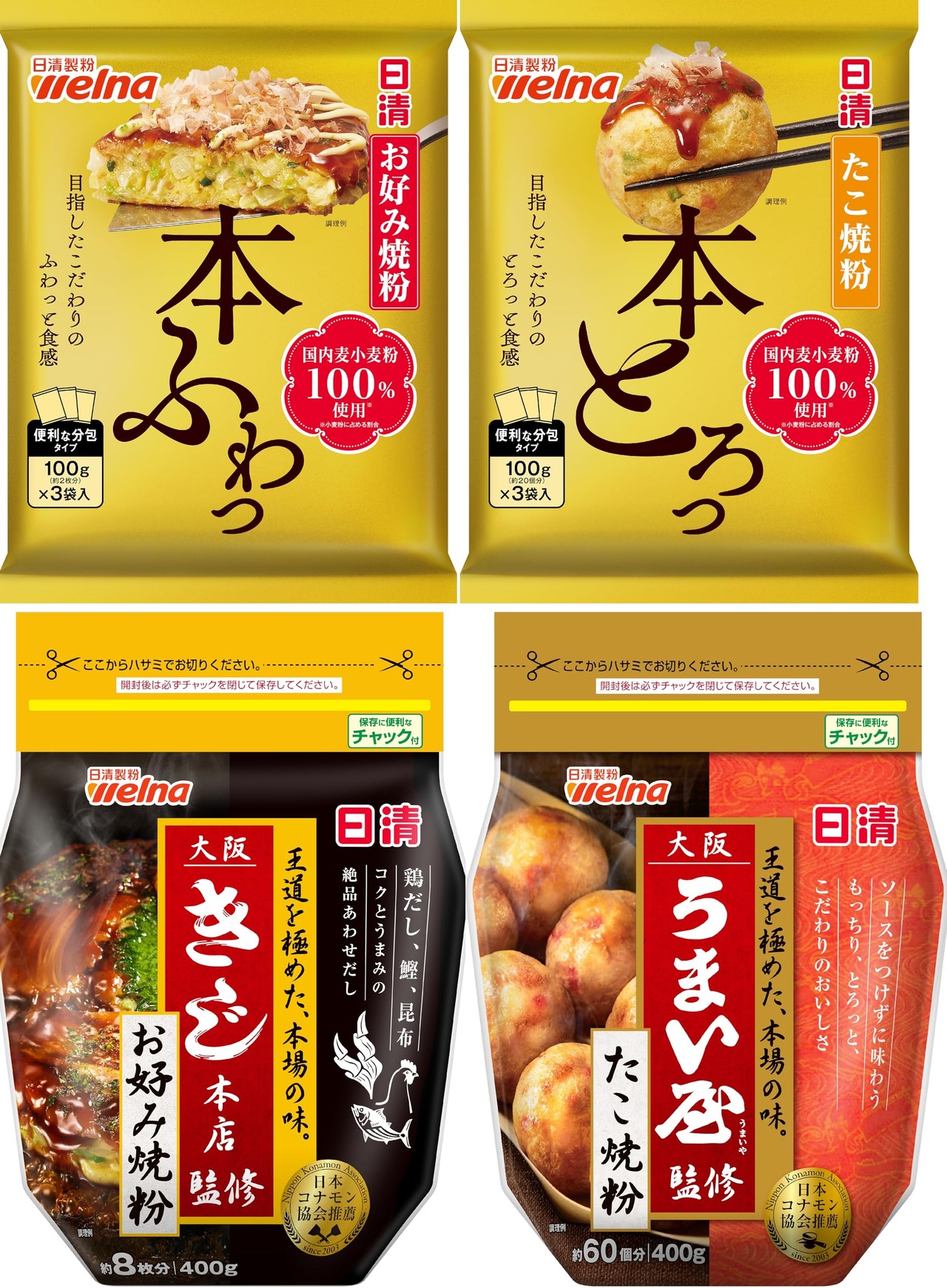 日清製粉ウェルナ 日清 国内小麦粉100%使用したふわとろ食感を楽しむ&名店監修を楽しむ お好み焼粉・たこ焼粉食べ比べセット(本ふわっお好み焼粉、本とろったこ焼粉、大阪きじ本店監修お好み焼粉、大阪うまい屋監修たこ焼粉) 【セット買い】