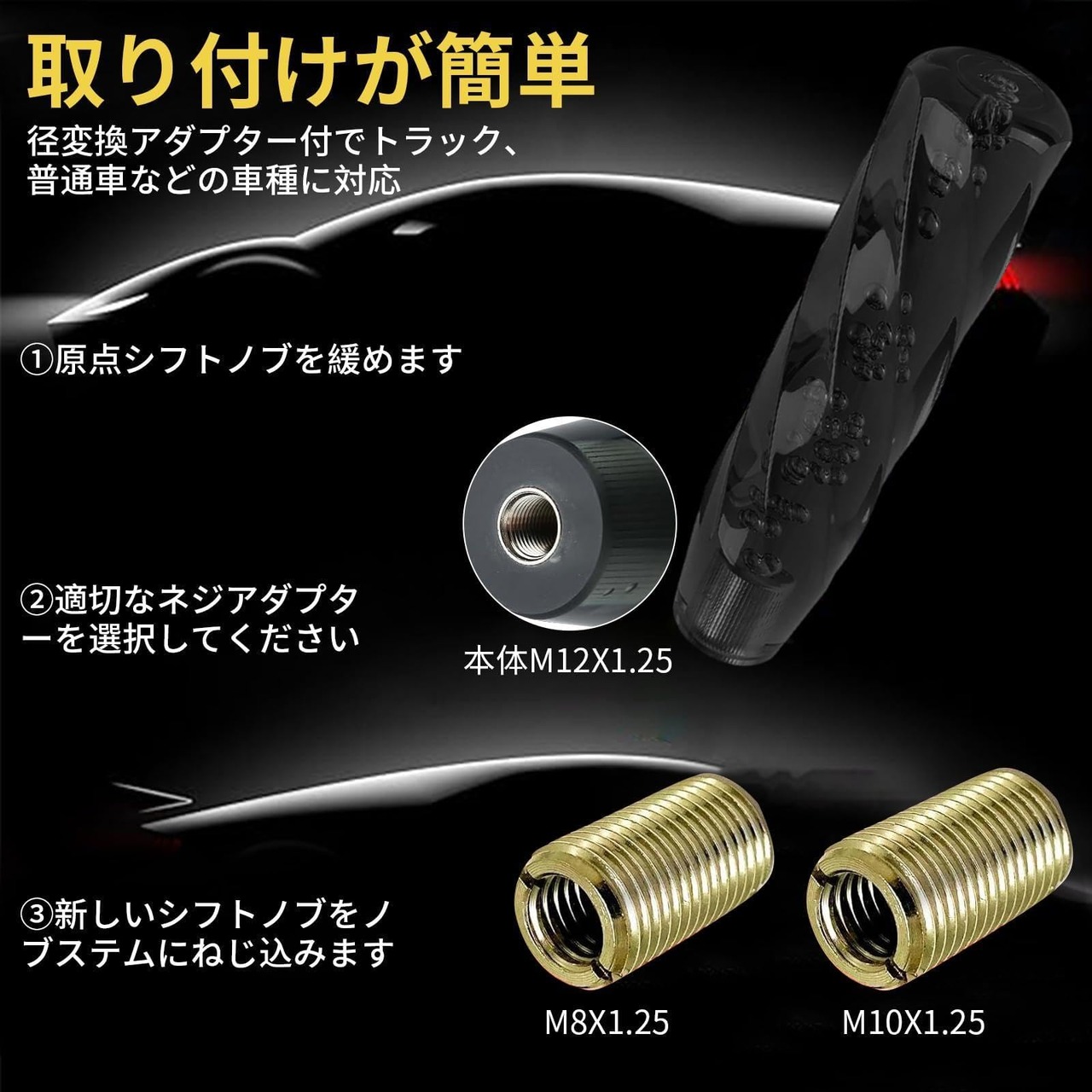 【様々な車種に対応】 シフトノブ自体は M12 x 1.25 で、2 つの合金ねじリングフィッティング M8 x 1.25 および M10 x 1.25 が付属します。