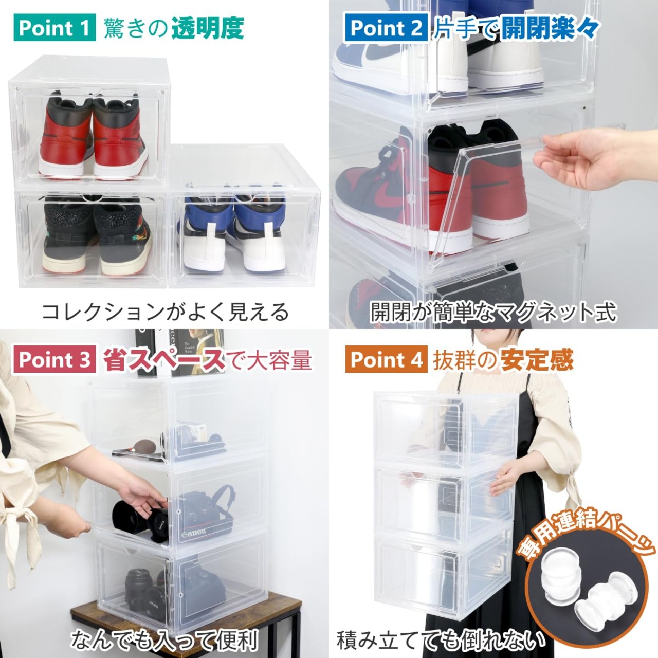連結可能でスペース効率的:四方向に連結可能な透明クリアシューズボックス。スニーカーやフィギュア、化粧品の収納に最適。スリムで場所を取らず、マグネット棚を使用し、耐久性のあるプラスチック製で手軽に配置変更可能。