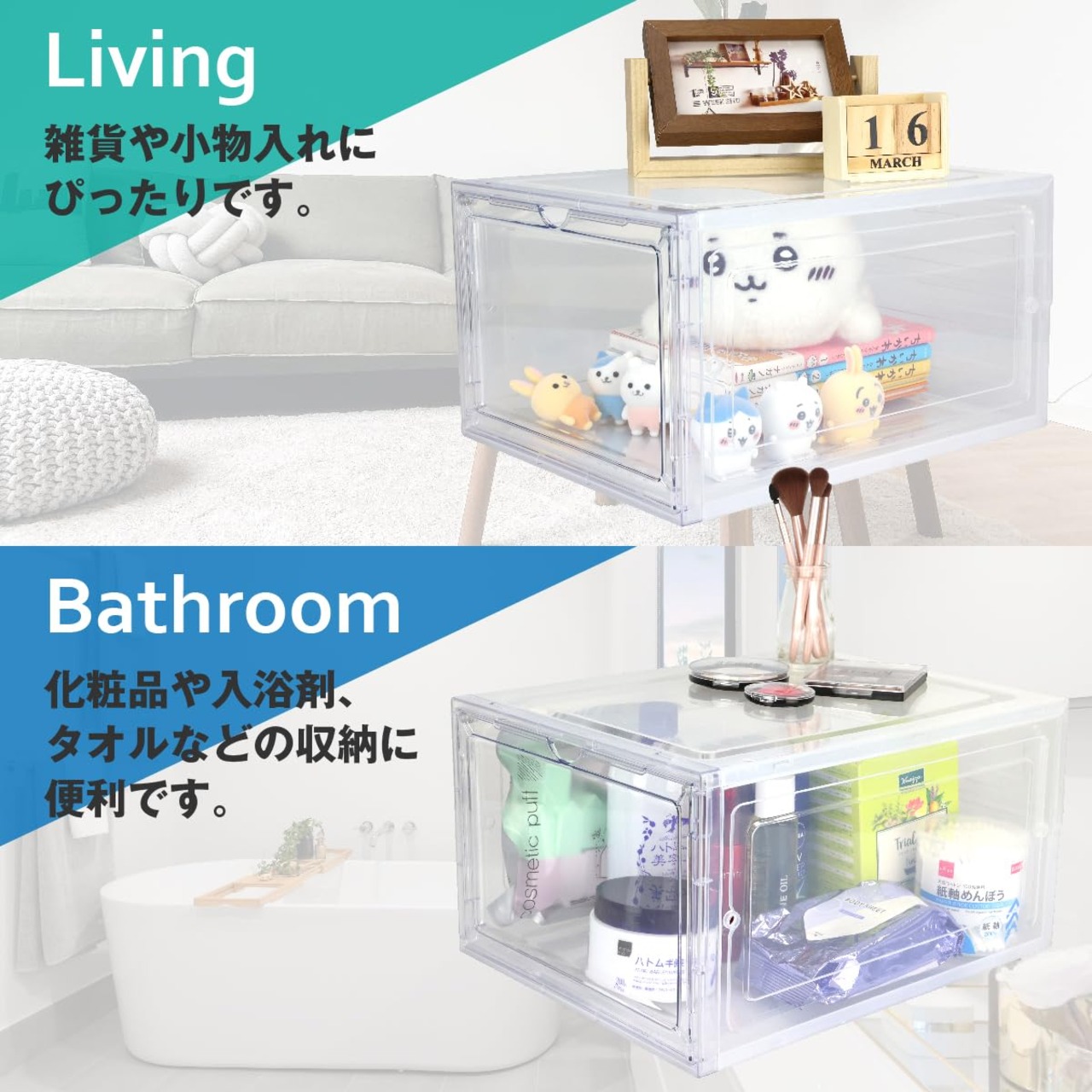 汎用性の高いデザイン:クリアプラスチック製で水洗い可能、軽量で移動が簡単。玄関やリビングでの隙間収納に最適。フィギュアから小物、シューケアボックスまで多目的に使用可能。スリムな形状で効率的にスペースを活用。