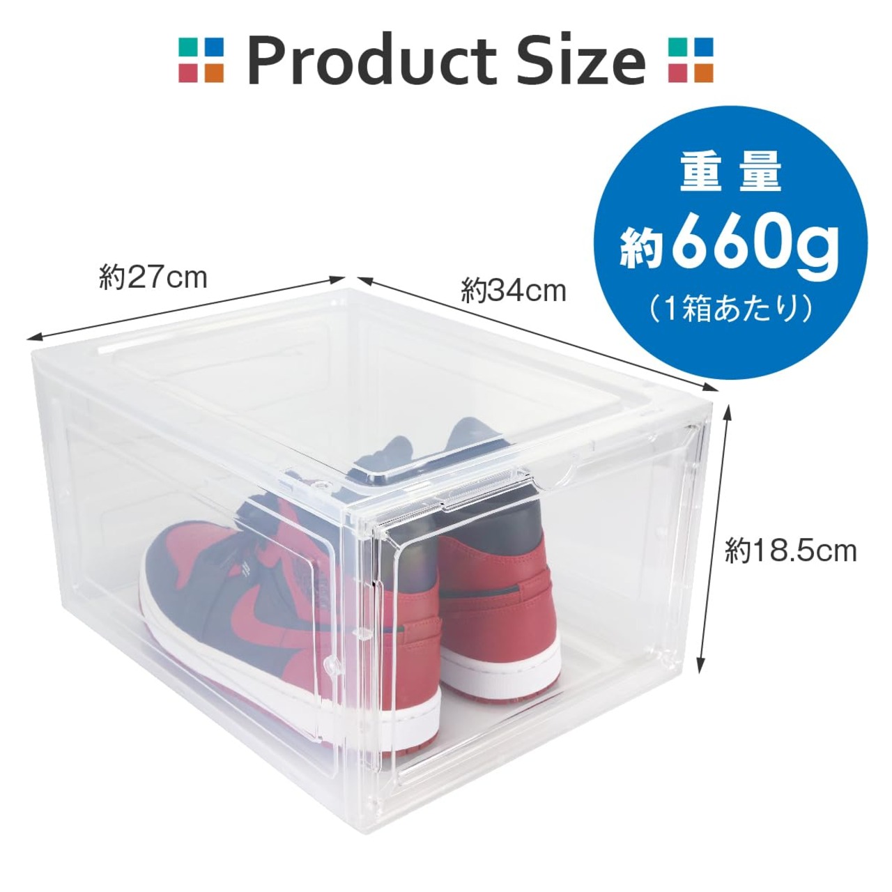 多機能シューズケース:ハイカットスニーカーやナイキ限定品など、大切なコレクションを美しく展示。クリアケースで隙間収納にも適し、どの角度からも鮮明に見えます。フィギュアや文房具の保管にも理想的。サイズ: 縦18.5cm×横27cm×奥行34cm、重量: 644g