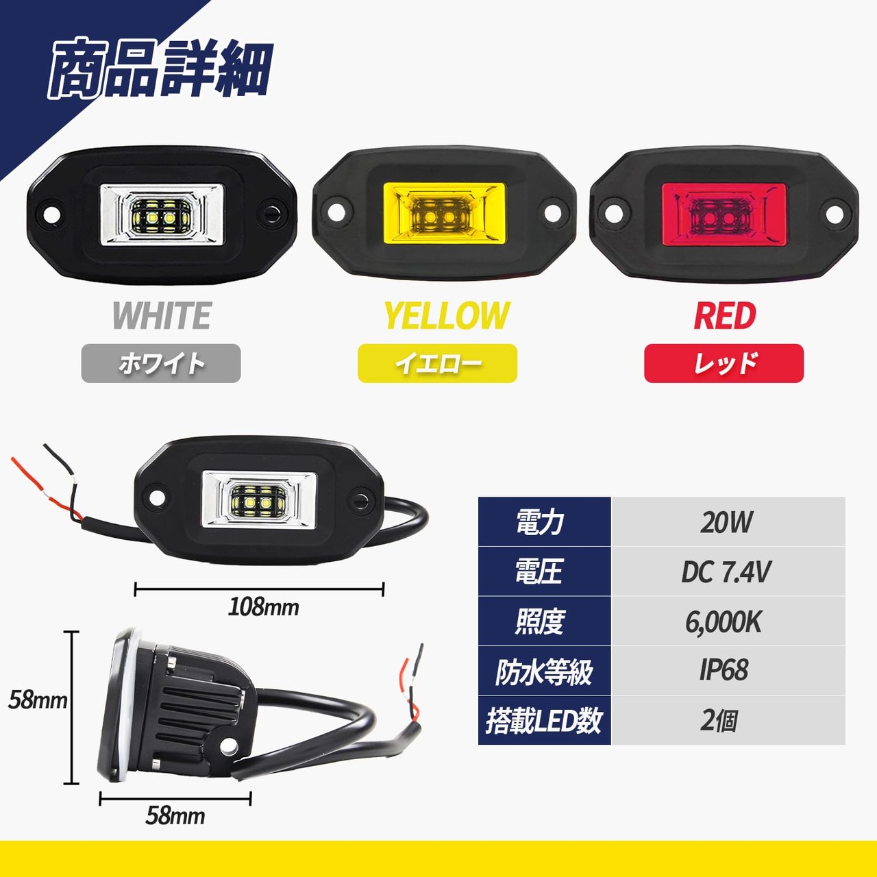 【夜間作業も安心!多用途に使えるLED作業灯】 暗闇でも明るく照らす高性能LED作業灯。バンパーやグリルに埋め込むだけで、愛車をカスタマイズ!オフロード、キャンプ、夜釣りなど、様々なシーンで大活躍。防水防塵機能付きで、悪天候でも安心。長寿命で耐久性も抜群です。※取り付け説明書は付属していないため、ご自身での作業が難しい場合は、専門の方に依頼される事をお勧め致します。
