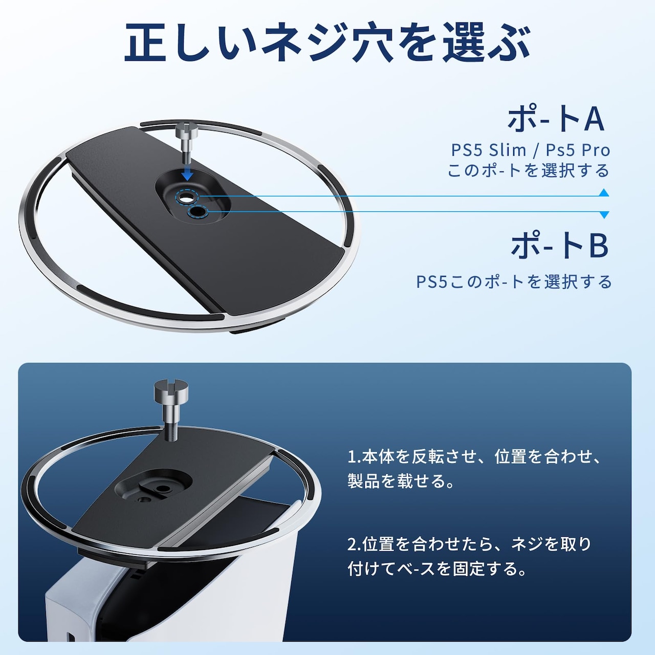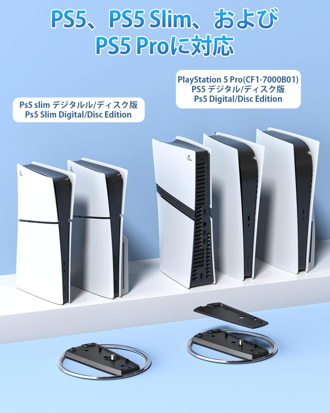 【サービス内容】2つのベーススタンドがあり、小さい方はPS5ディスク&デジタルに対応します、大きい方はPS5 Slimディスク&デジタルおよびPS5 Proに対応します。頑丈なネジと素晴らしいアフターサービスを提供します。商品について何かご質問がございましたら、お気軽にメールでお問い合わせください。
