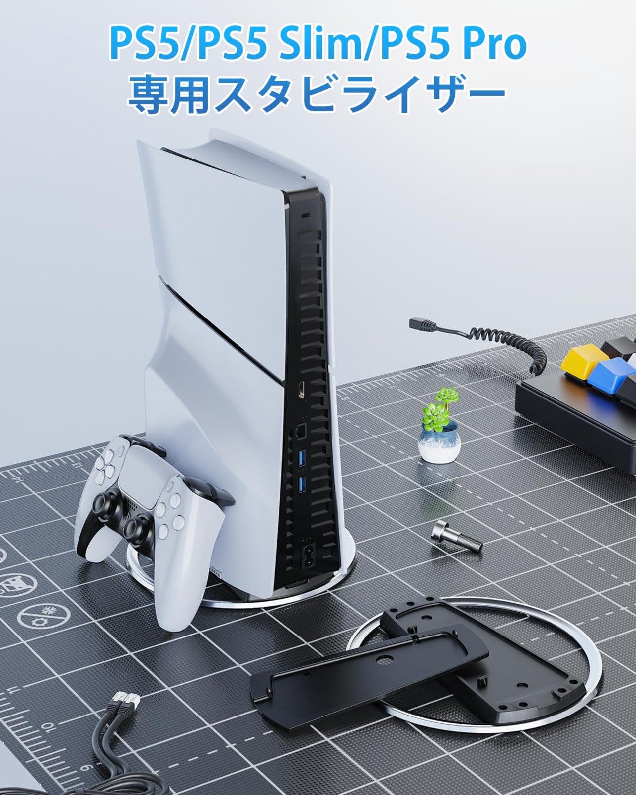 PS5 Slim/PS5/PS5 Pro縦置きスタンド,For PlayStation 5 専用,転倒防止 地震対策 傷付き防止 放熱改善,PS5 スタンド,PS5 縦置きスタンド,PS5 Slim スタンド,PS5 Pro対応 PS5 周辺機器 【PS5/PS5 Slim/PS5 Proスタンド】PS5 Slim Disc&Digital / PS5 Disc&Digital / PS5 Pro用の縦型ドックスタンドです。底面には滑り止めのシリコンリング、本体固定用のネジが付属。これにより、PS5コンソールへの意外なぶつかりによる落下を防止し、コンソールを安定した位置に維持します。 【ミニマルなスタンド、省スペース】コンパクトで縦置きスタンドとして狭い場所でもPS5本体を設置できます。プレステ5スタンド洗練されたモダンなデザインを誇ります。PS5 Slim、PS5 Proの美しさを補完し、ゲームセットアップ全体の視覚的な魅力を高めます。 【高品質の素材を使用】PS5コンソールアクセサリーは高品質の素材で丁寧に設計されています。 センターベースは高硬度ABS複合樹脂を採用し、は耐腐食性、耐熱性、放熱性に優れ、無臭です。リングは高炭素合金ステンレス鋼リングを採用し、硬くて耐磨耗性に優れ、表面は滑らかで美しいです。 【放熱改善、取り付け簡単】縦型ベーススタンドはPS5コンソールから発生する熱をより効果的に放熱します、空気循環を促進することで。高品質のABSは放熱性に優れ、ゲーム機の放熱機能を最適化し、長時間のゲーム中に最高のパフォーマンスを発揮し、ゲーム機の寿命を延ばすパフォーマンスエンハンサーでもあります。取り付けはPS5本体とスタンドの形状を合わせ、固定用ネジを固定するだけのカンタン取り付け! 【サービス内容】2つのベーススタンドがあり、小さい方はPS5ディスク&デジタルに対応します、大きい方はPS5 Slimディスク&デジタルおよびPS5 Proに対応します。頑丈なネジと素晴らしいアフターサービスを提供します。商品について何かご質問がございましたら、お気軽にメールでお問い合わせください。