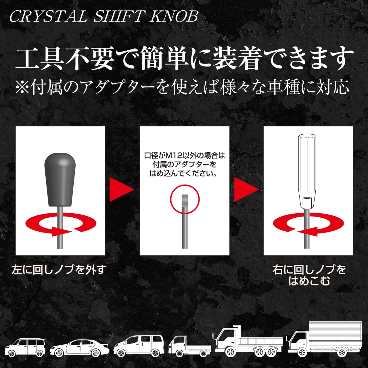 ⚫︎握りやすく滑りにくいグリップサイズのシフトノブ。シフト操作もスムーズに行え長時間運転する場合にも疲れにくい設計となっております。クリスタル気泡デザインは透明感がありおしゃれな車内を演出してくれます。デコトラから普通車まで幅広い車種に対応し、車内のドレスアップに最適の商品です。