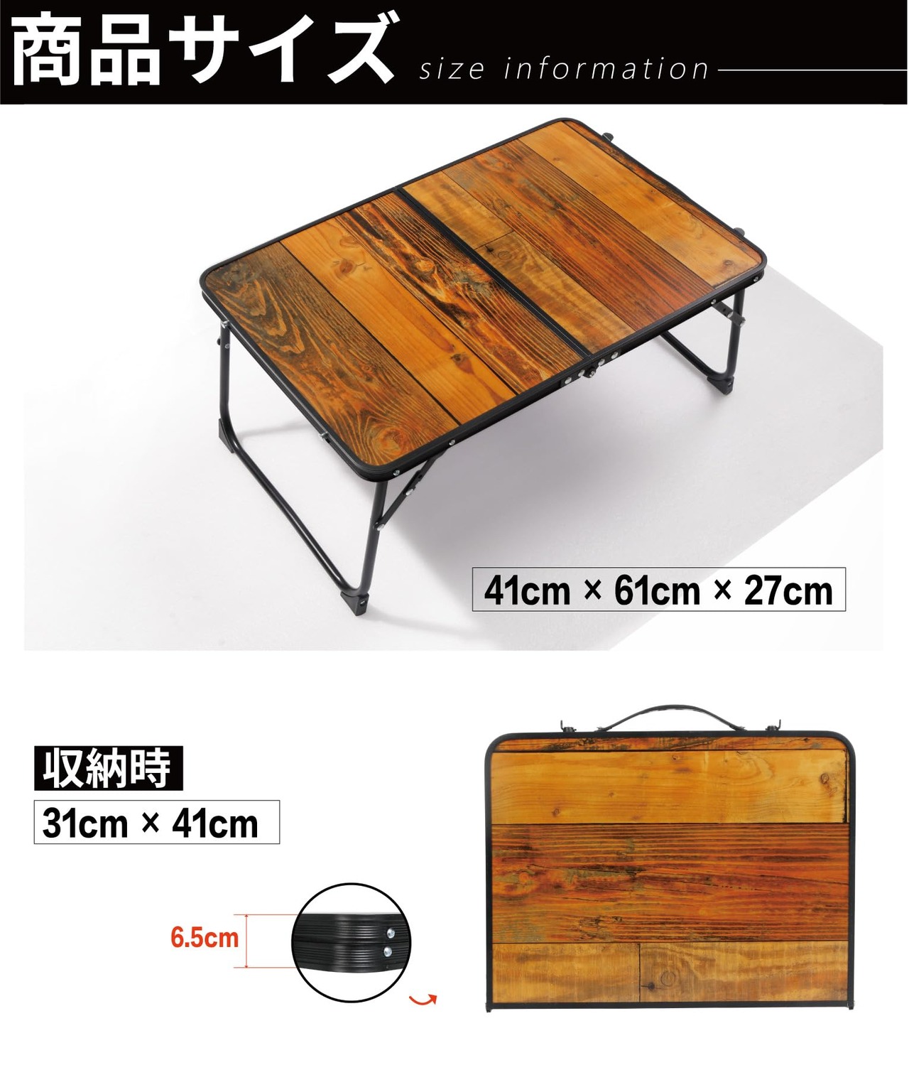 ☆アウトドアや運動会、行楽シーズンに大活躍の折りたたみテーブル。天板のサイズは61cm×41cm、キャンプやお花見、お釣りでは食材やコップ、調理器具が置けるので、1~3人用にオススメです。高さは27cmなので、ロータイプのチェアと合わせて使うのに最適。