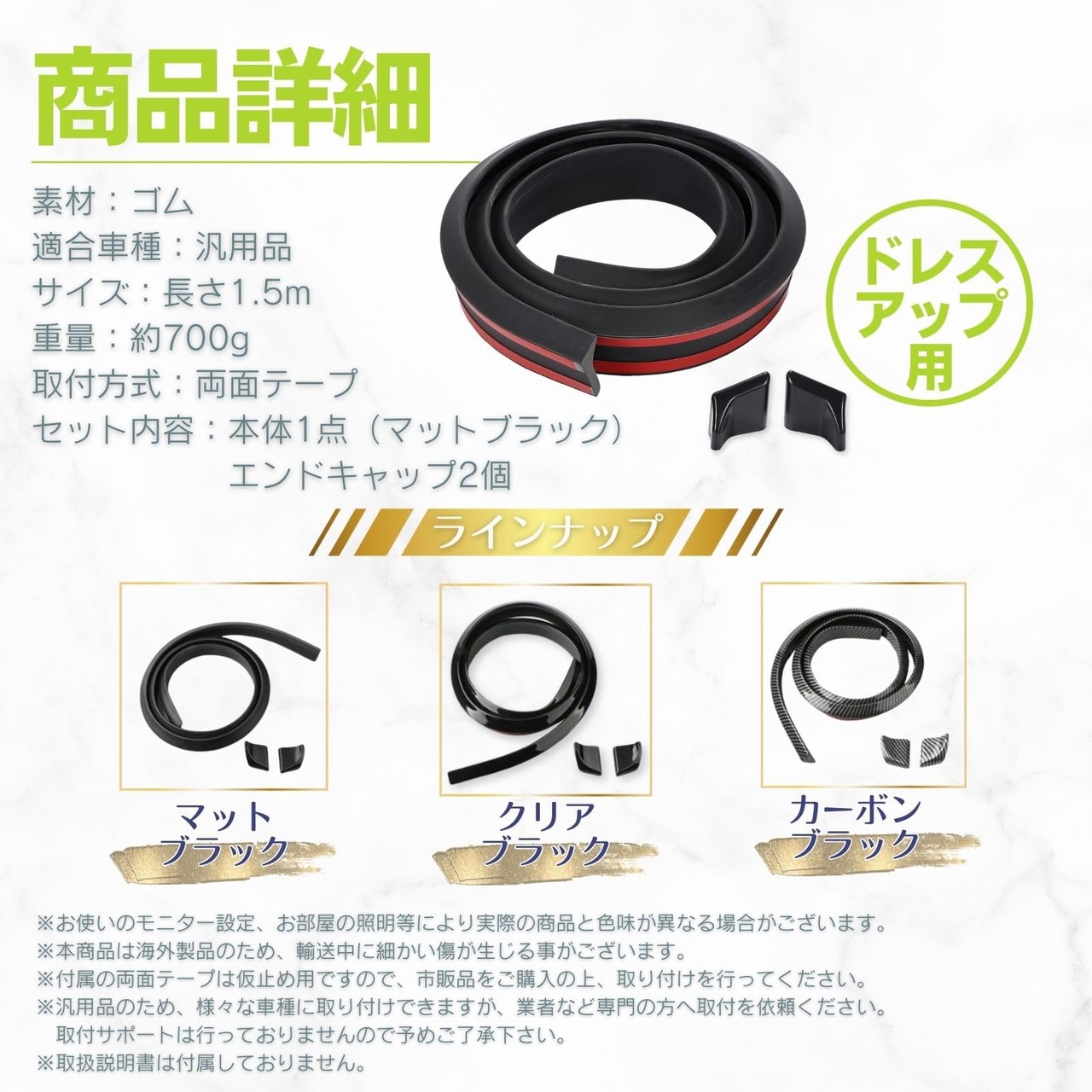 このエアロパーツはリアスポイラー、テールゲートスポイラー、ルーフスポイラー、バンパースポイラー、ロアスカート、トランクスポイラーとして機能し、穴を開けずに両面テープで取り付け可能で、車体に沿ってフィットし専用のエンドキャップで美しく仕上げることができます。カラーバリエーションは、お好みに合わせてマットブラック、クリアブラック、カーボンブラックの3種類から選べ、愛車の外観をスタイリッシュにカスタマイズできます。製品の取り付けは、部品の脱脂と清掃後、付属の仮止め用両面テープを使用して行い、柔軟な素材であるためカットして調整可能です。低温時は製品をドライヤーで温めることで取り付けが容易になりますが、曲面や球面では取り付けが困難な場合があり、あくまで仮止め用の両面テープですので、接着力が不足している時は追加の両面テープで補強することをお勧めします。説明書は付属しておりません。比較的用意に取り付け可能ですが、専門業者による取り付けが推奨されます。